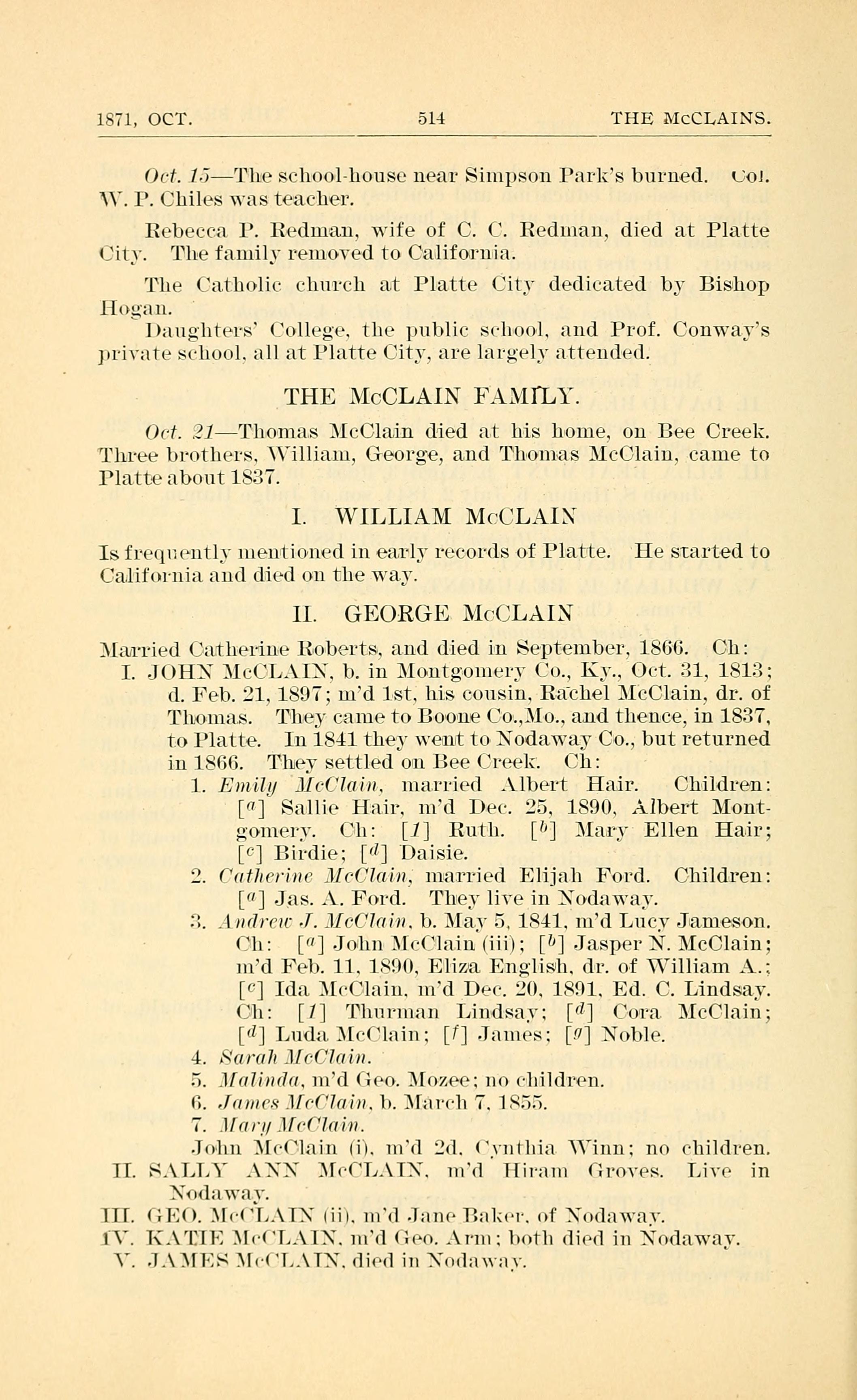 Oct. 21 - Thomas McClain died at his home, on Bee Creek, Three brothers, William, George, and Thomas McClain, came to Platte about 1837.