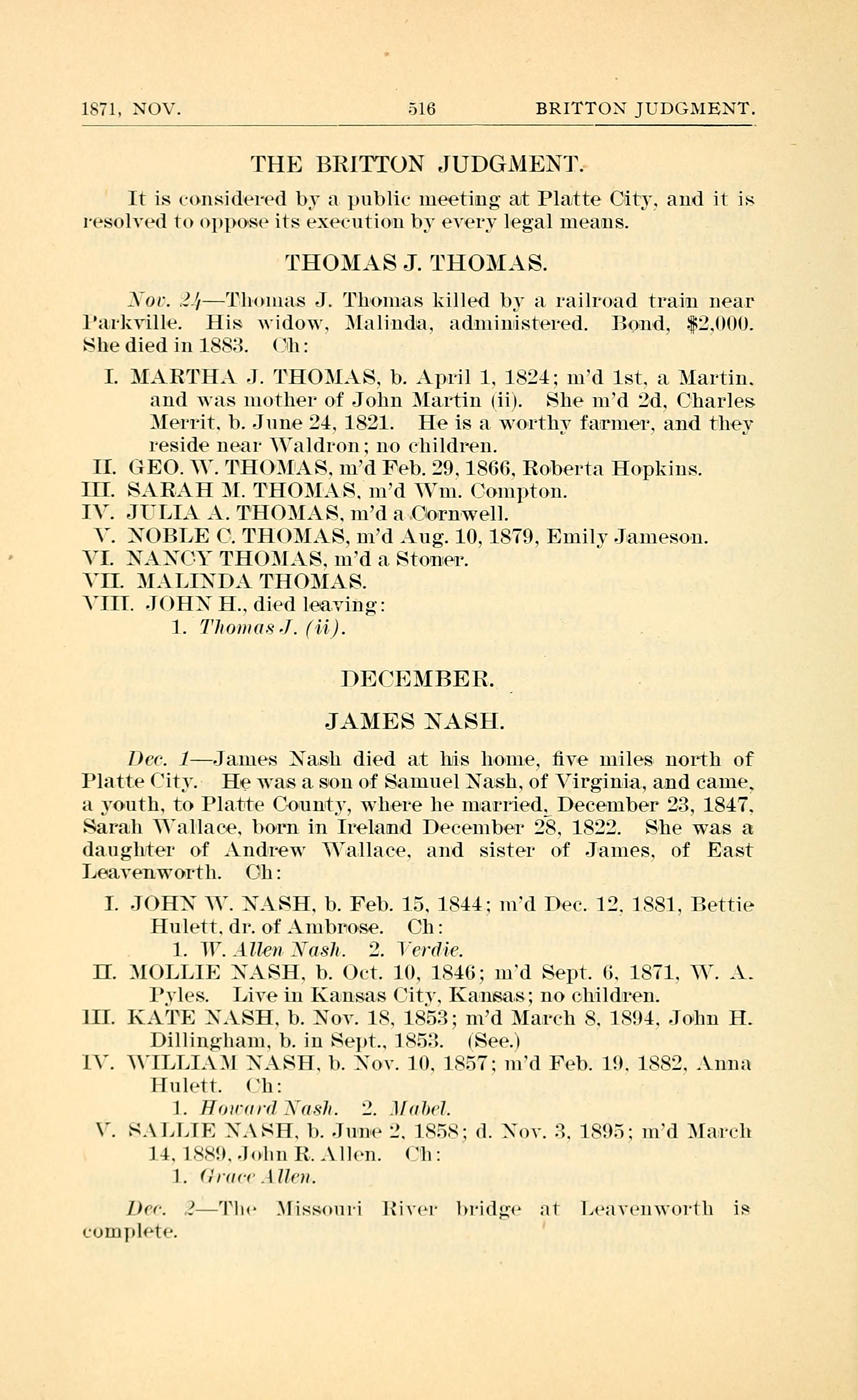 Nov. 24 - Thomas J. Thomas killed by a railroad car near Parkville. His widow, Malinda, administered. Bond, $2,000. She died in 1883. Children: