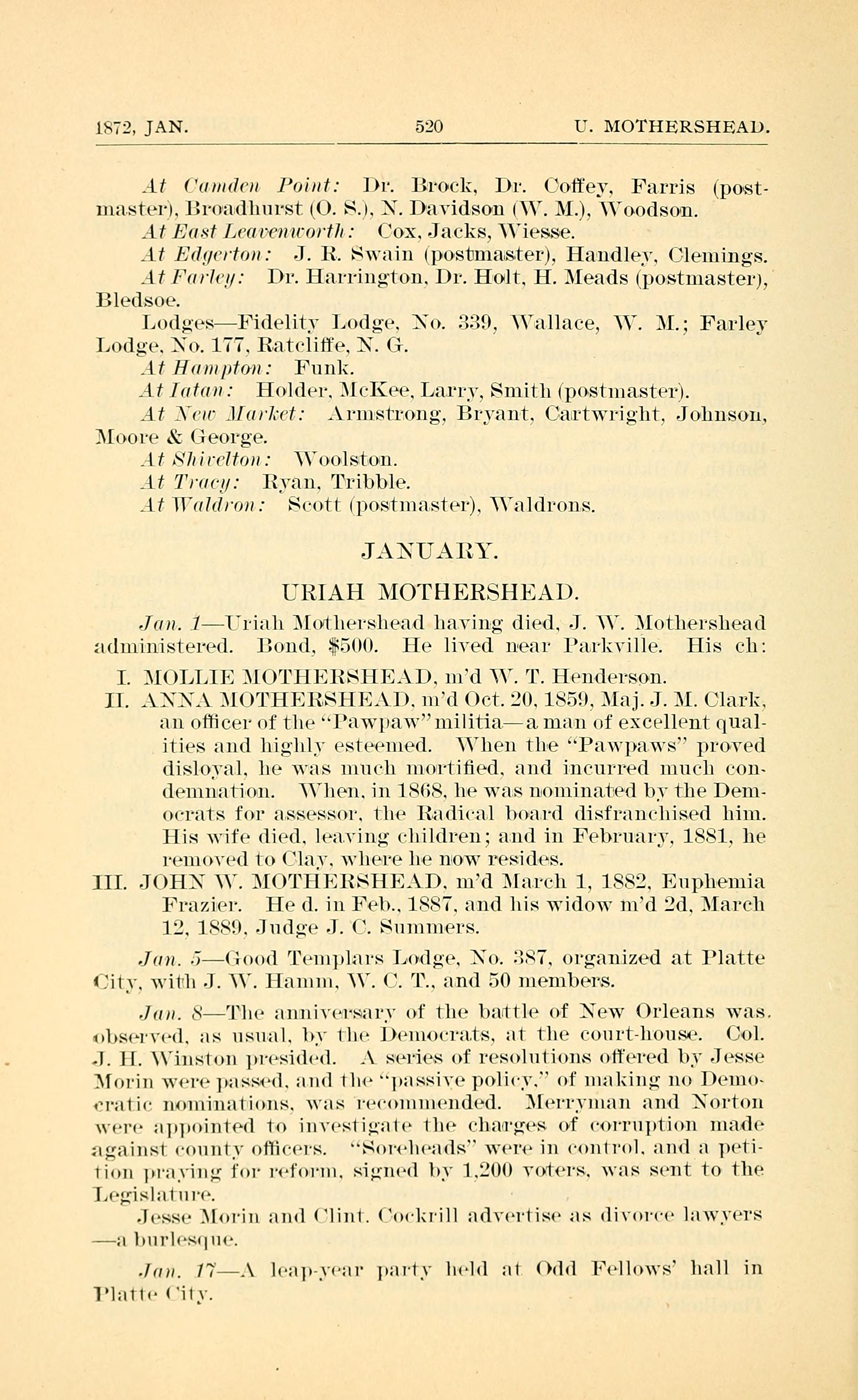 Jan. 1 - Uriah Mothershead having died, J. W. Mothershead administrered. Bond, $500. He lived near Parkville, His Children:
