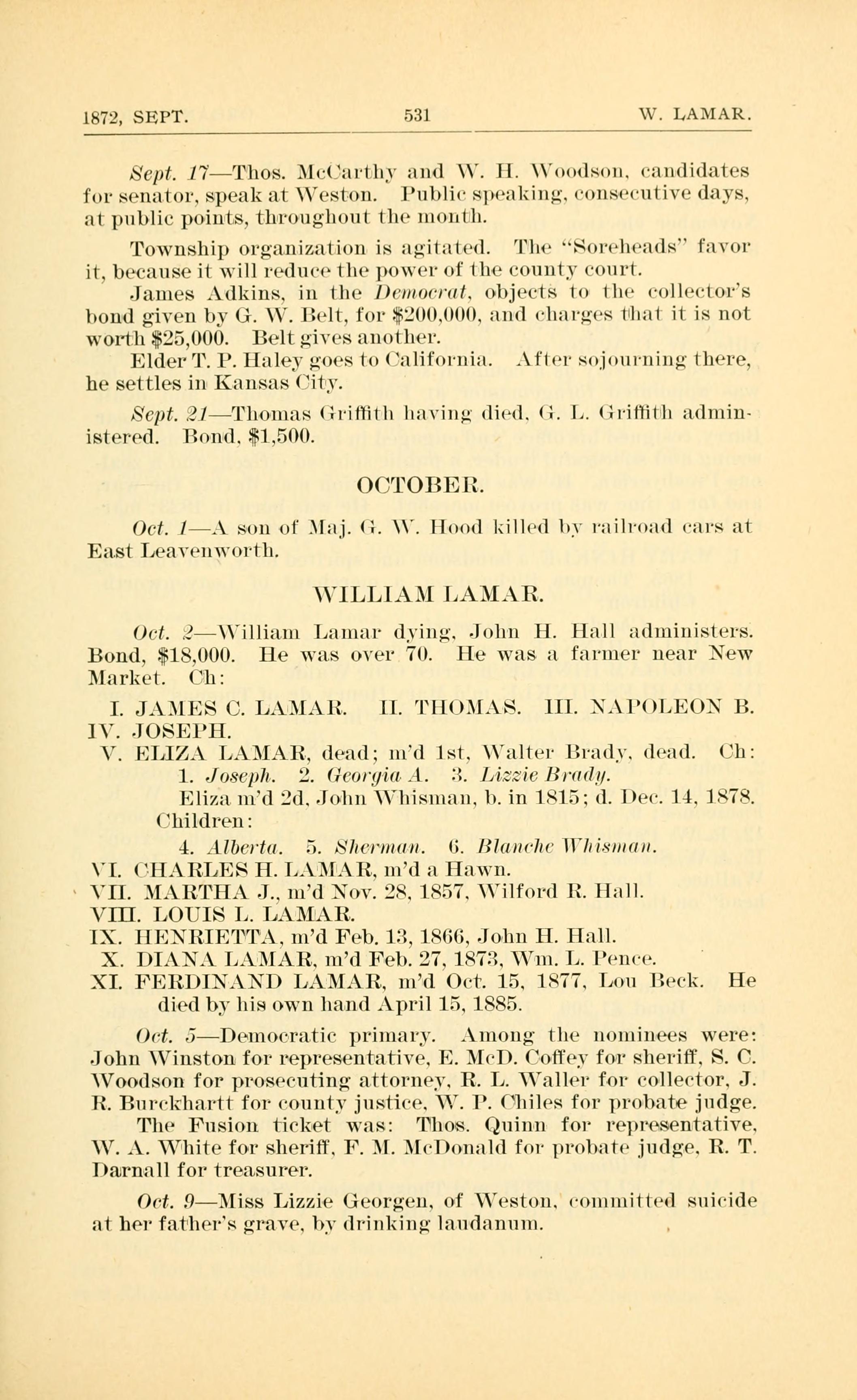 Oct. 2 - William Lamar dying, John H. Hall administers. Bond, $18,000. He was over 70. He was a farmer near New Market. Children: