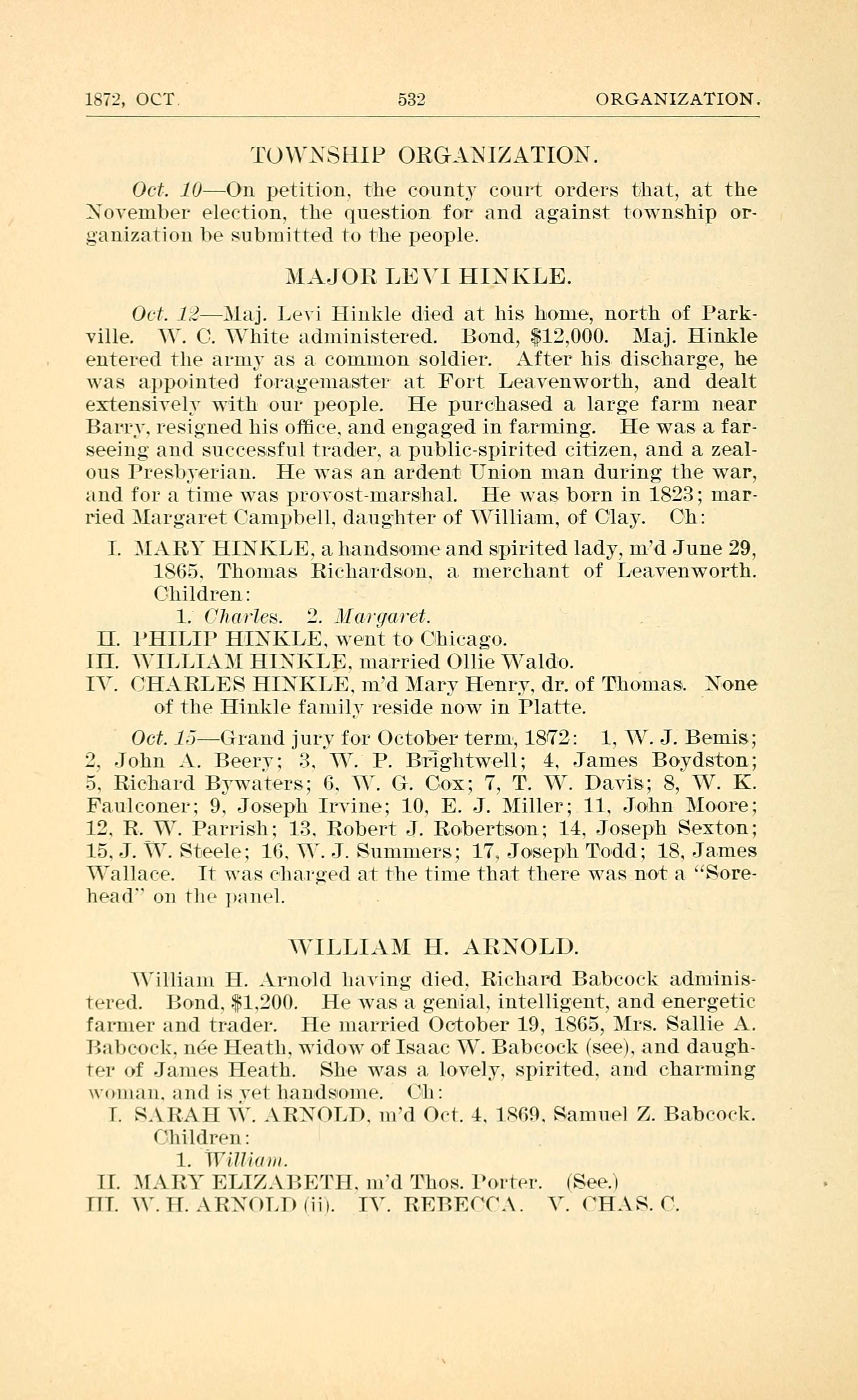 Oct. 1.3~Maj. Levi Hinkle died at his home, north of Park-