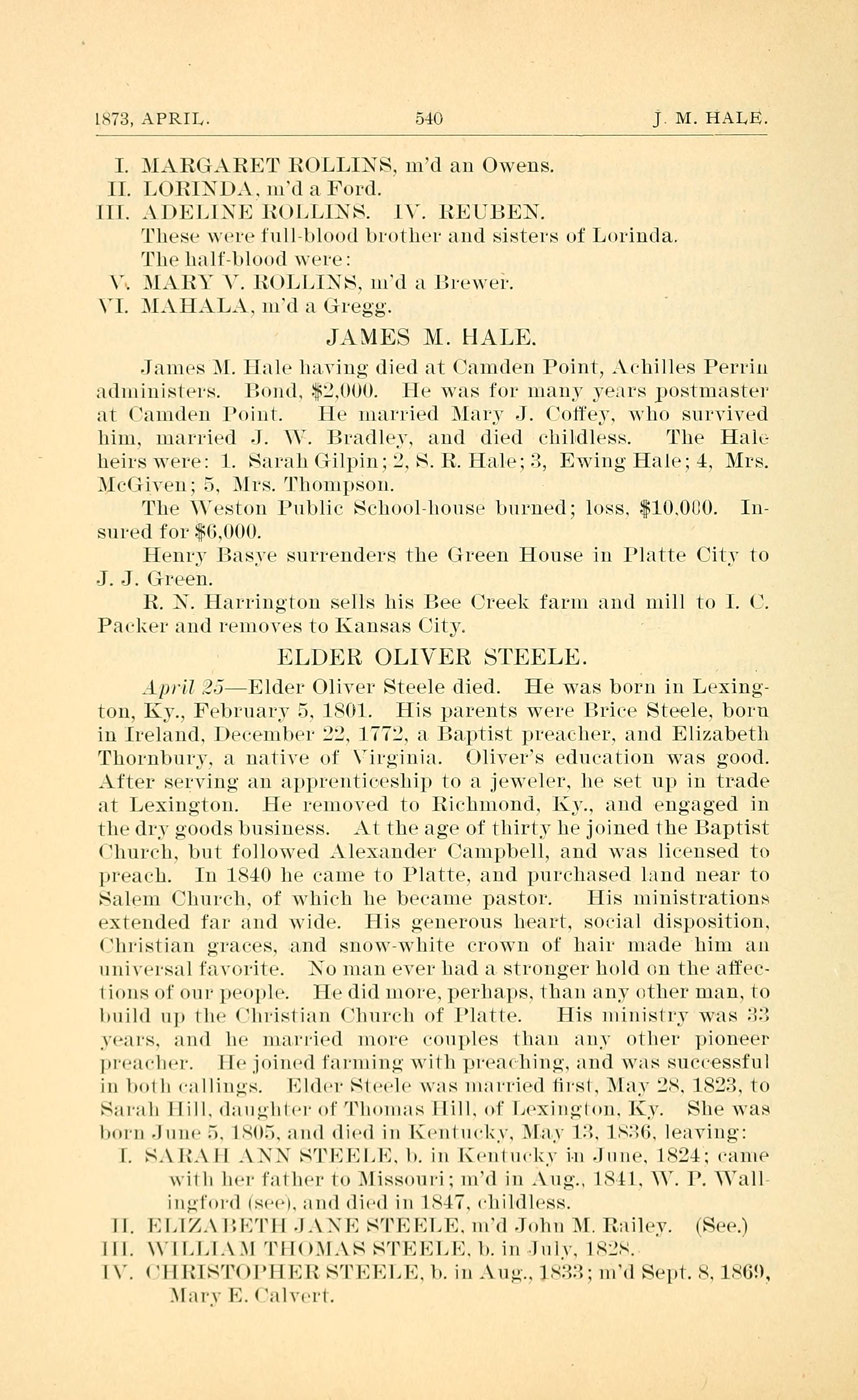 ELDER OLIVER STEELE died April 25, 1873