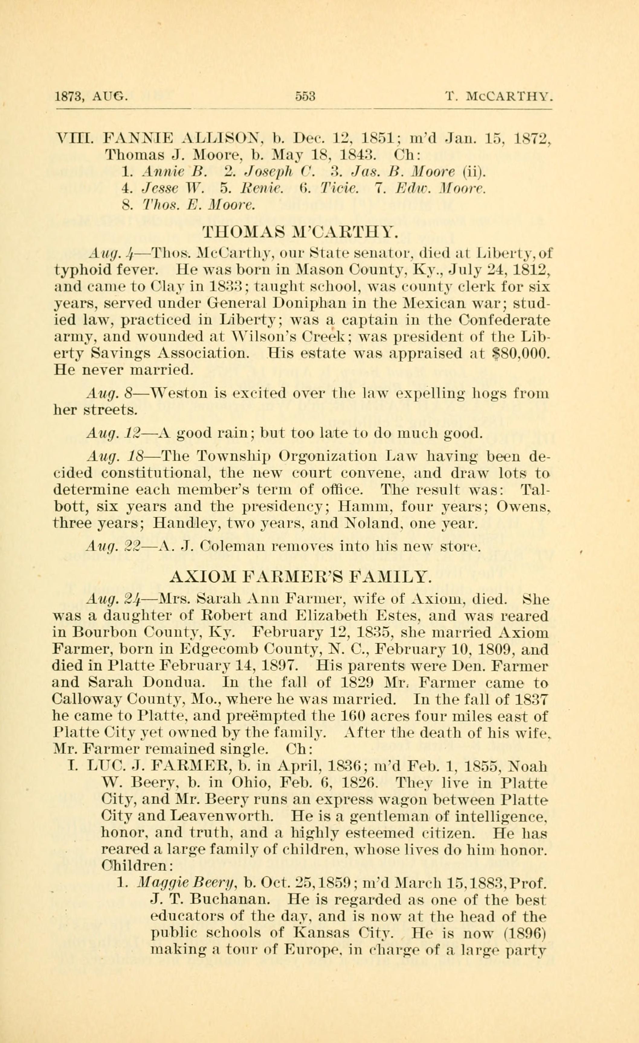Aug. .3;llrs. Sarah Ann Farmer, wife of Axiom, died. She