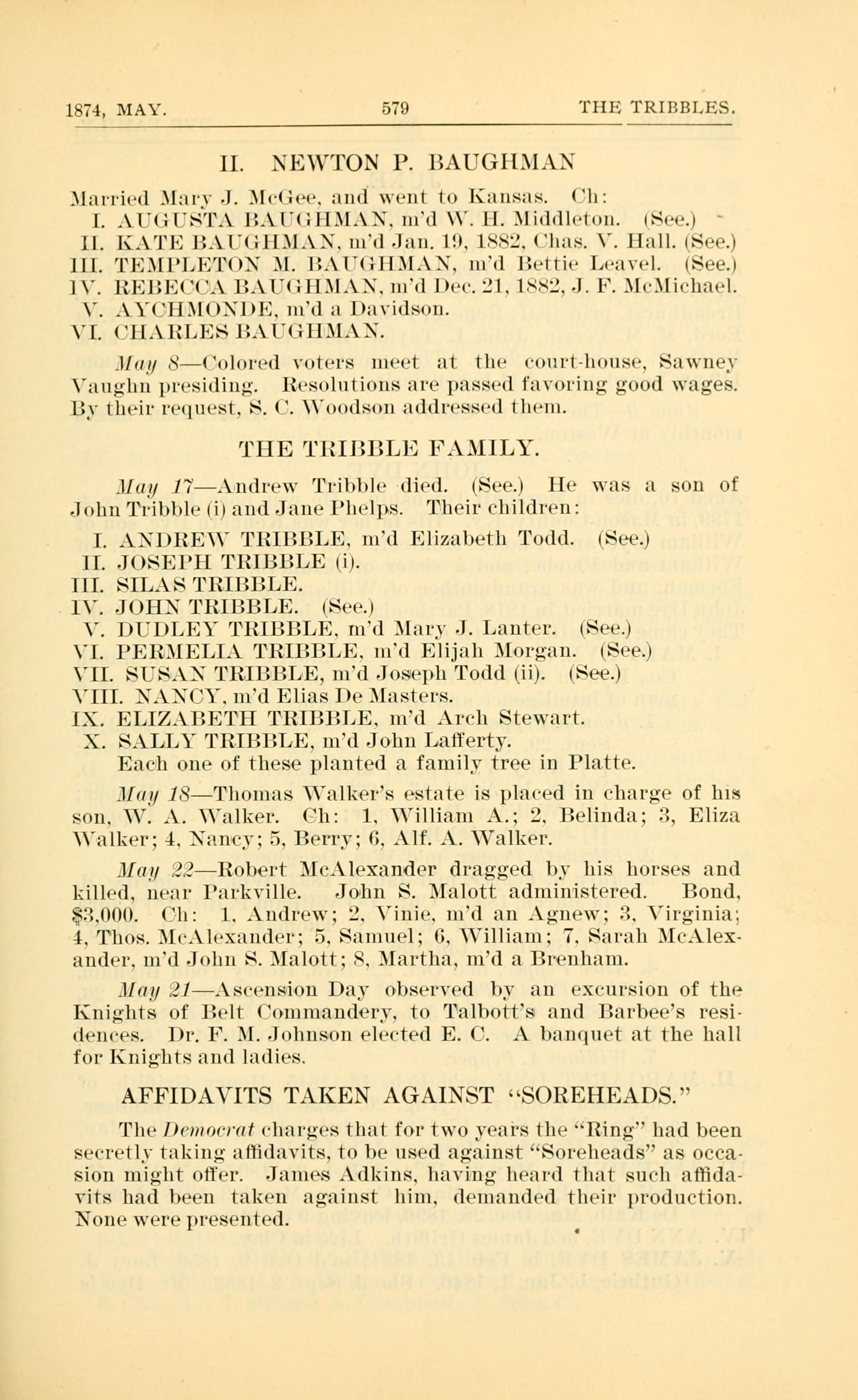 May 17 - Andrew Tribble died. He was a son of John Tribble (i) and Jane Phelps. Their children: