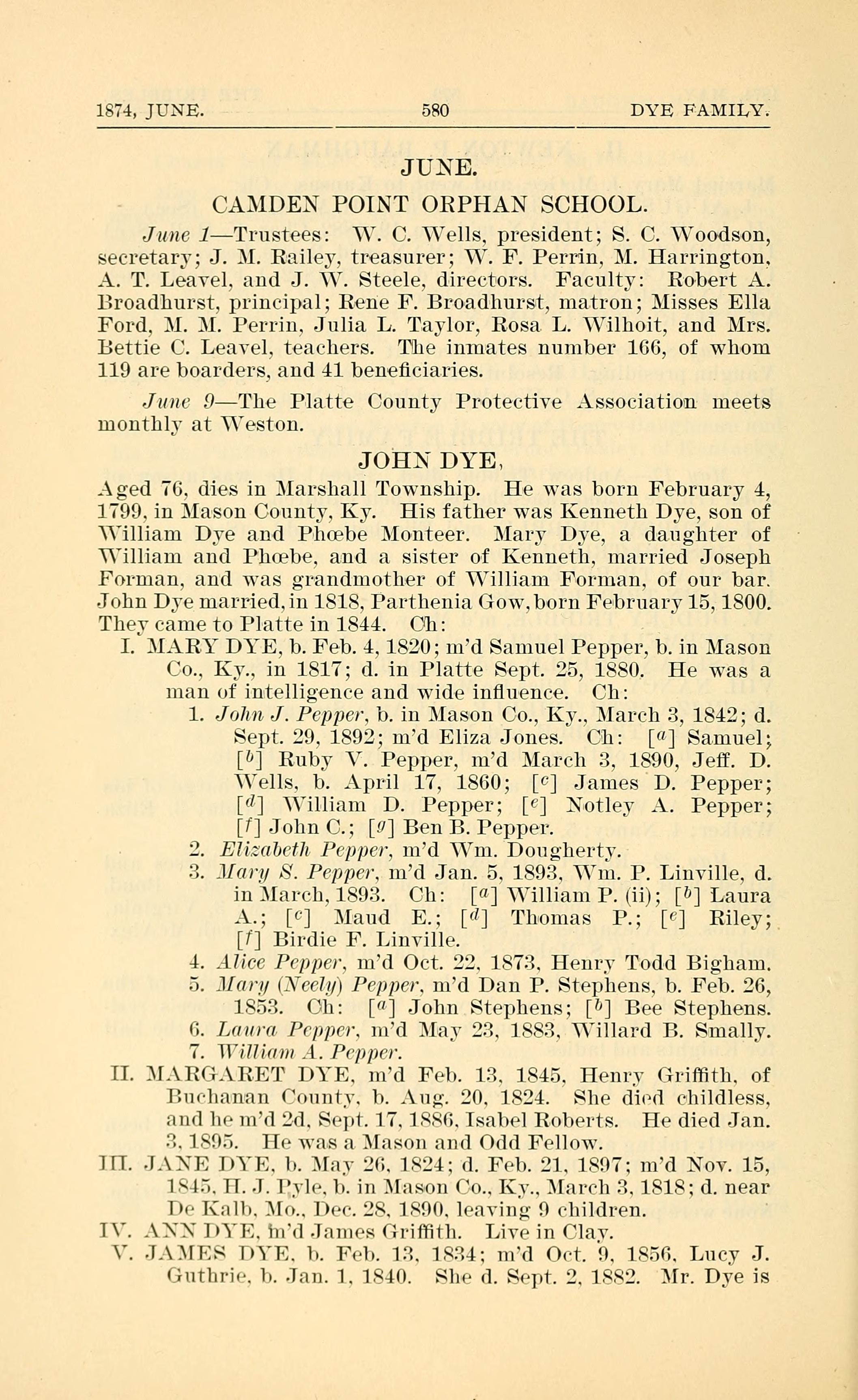 II. MARGARET DYE, married Feb. 13, 1845, Henry Griffith, of Buchanan County, b. Aug. 20, 1824. She died childless, and he married 2nd, Sept. 17, 1886, Isabel Roberts. He died Jan. 3, 1895. He was a Mason and Odd Fellow.