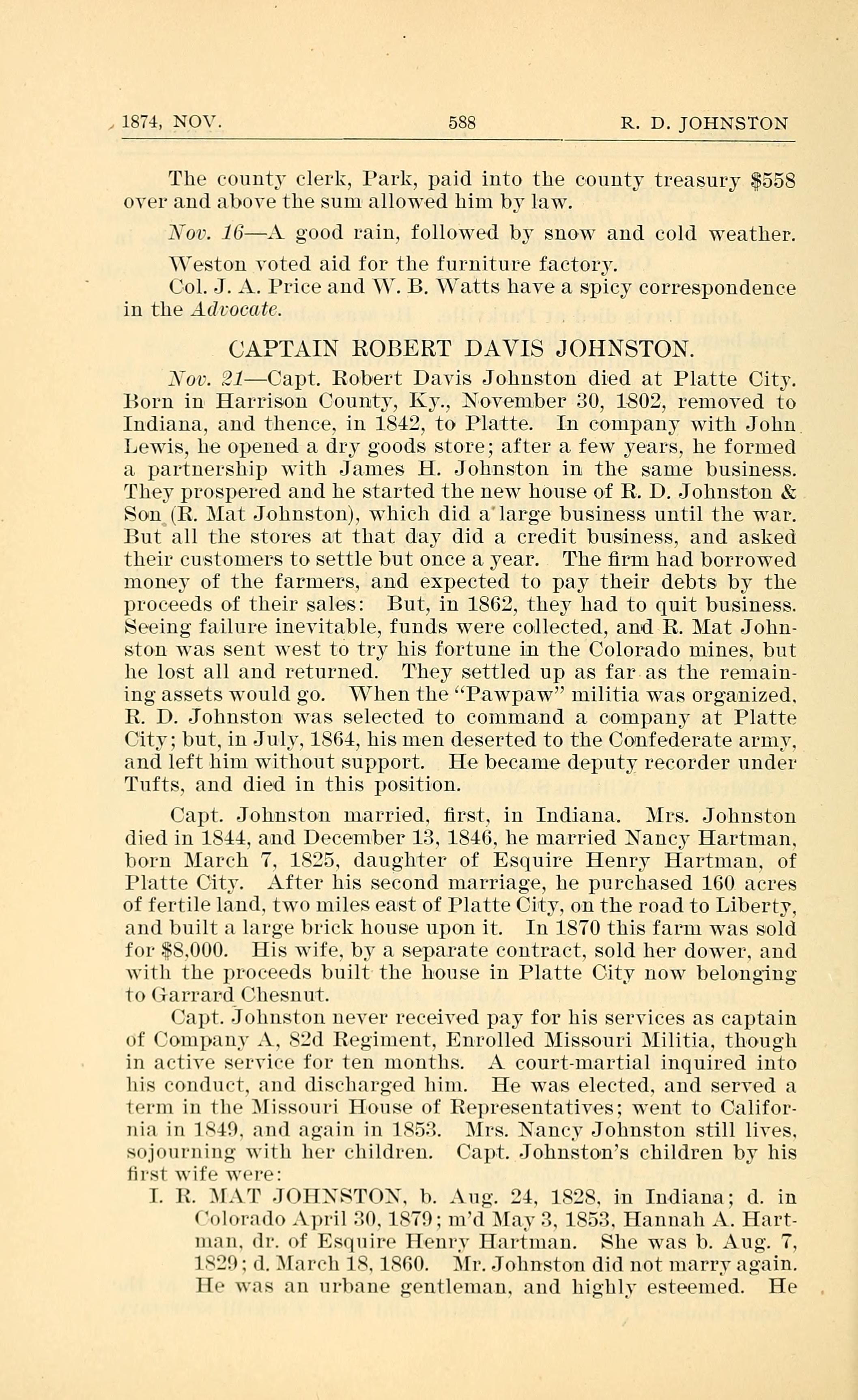 Nov. 21 Capt. Robert Davis Johnston died at Platte City.