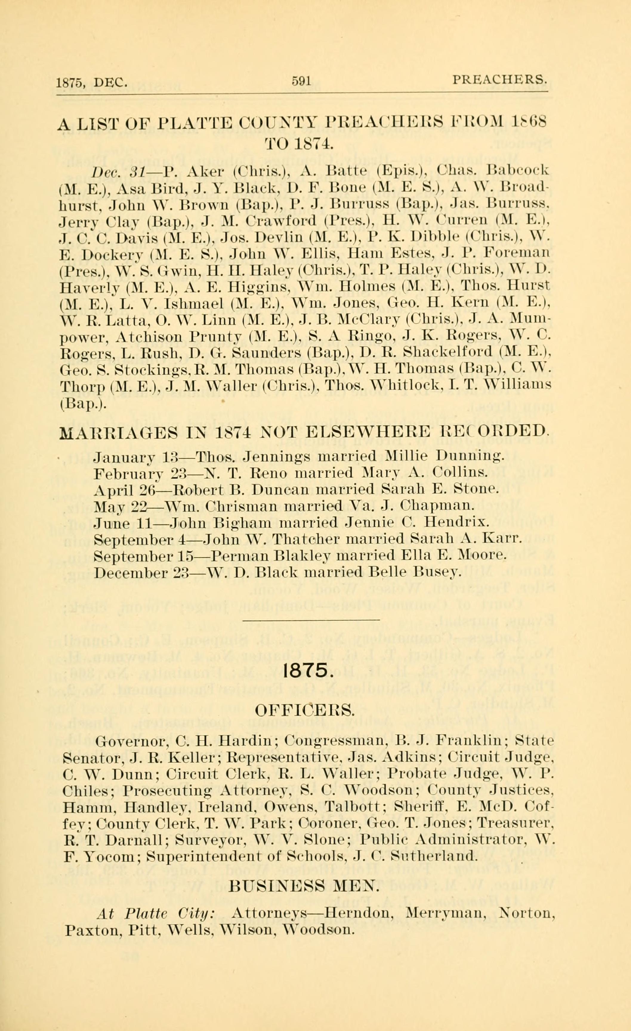 A LIST OF PLATTE COUNTY PREACHERS FROM 1868 to 1874.