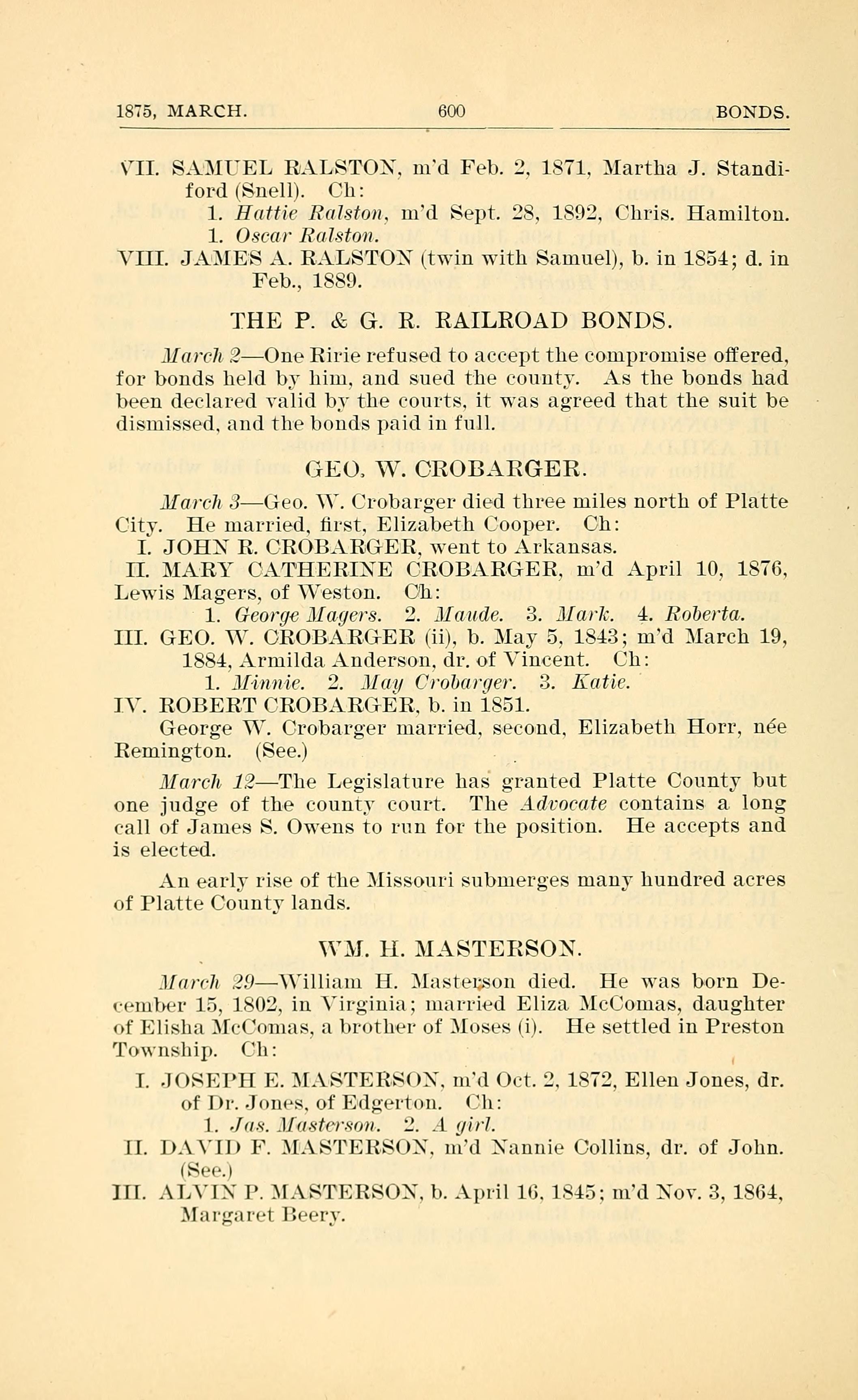 III. GEO. W. CROBARGER (ii), b. May 5, 1843; married March 19, 1884, Armilda Anderson, daughter of Vincent. Children: