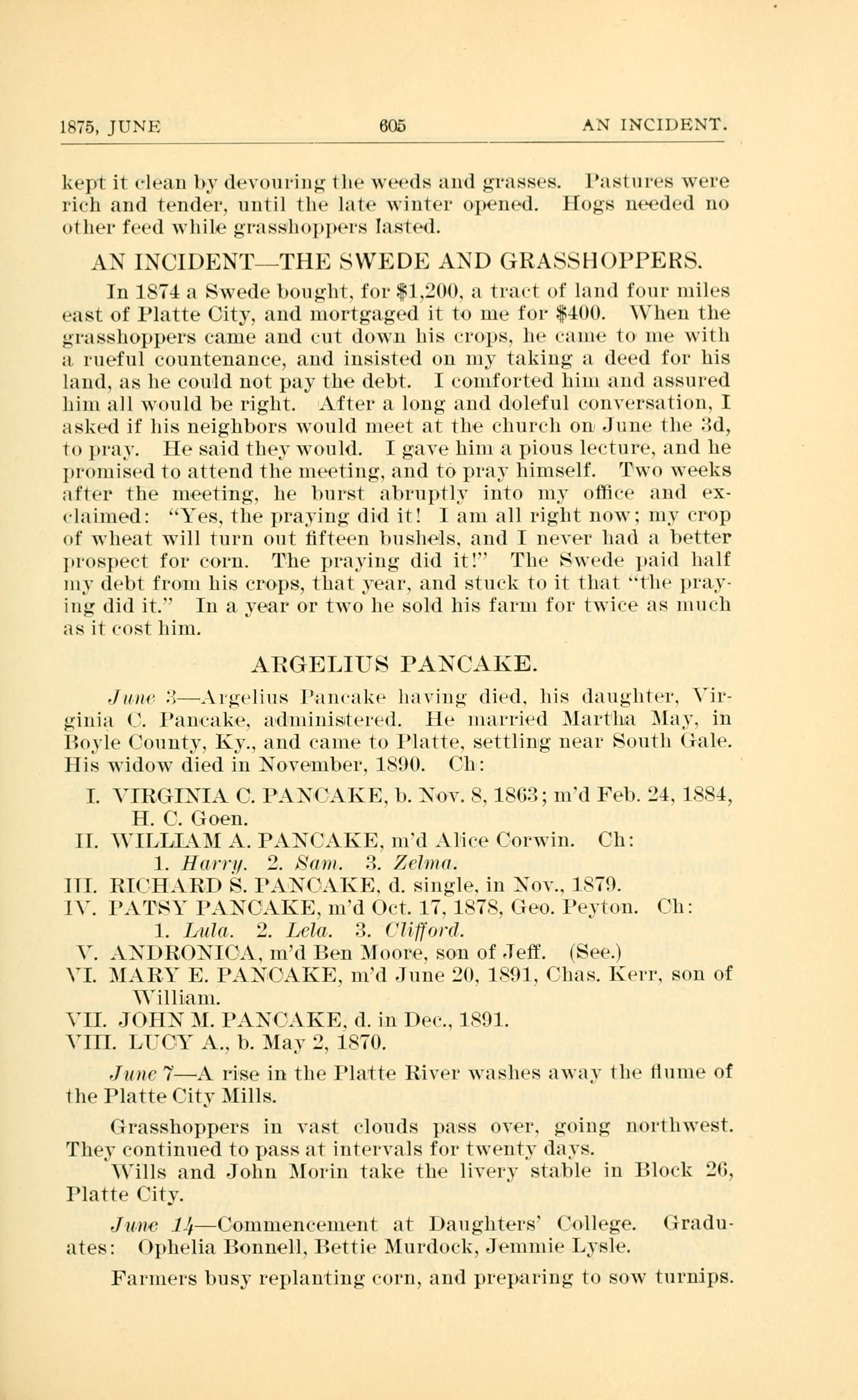 June 3 - Argelius Pancake having died, his daughter, Virginia C. Pancake, administered.