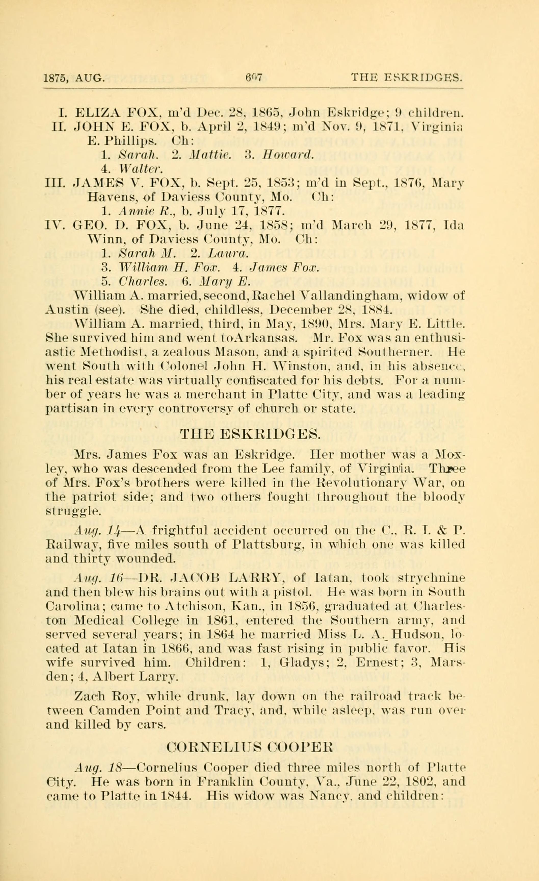 Mrs. James Fox was an Eskridge. Her mother was a Moxley, who was descended from the Lee family, of Virginia.