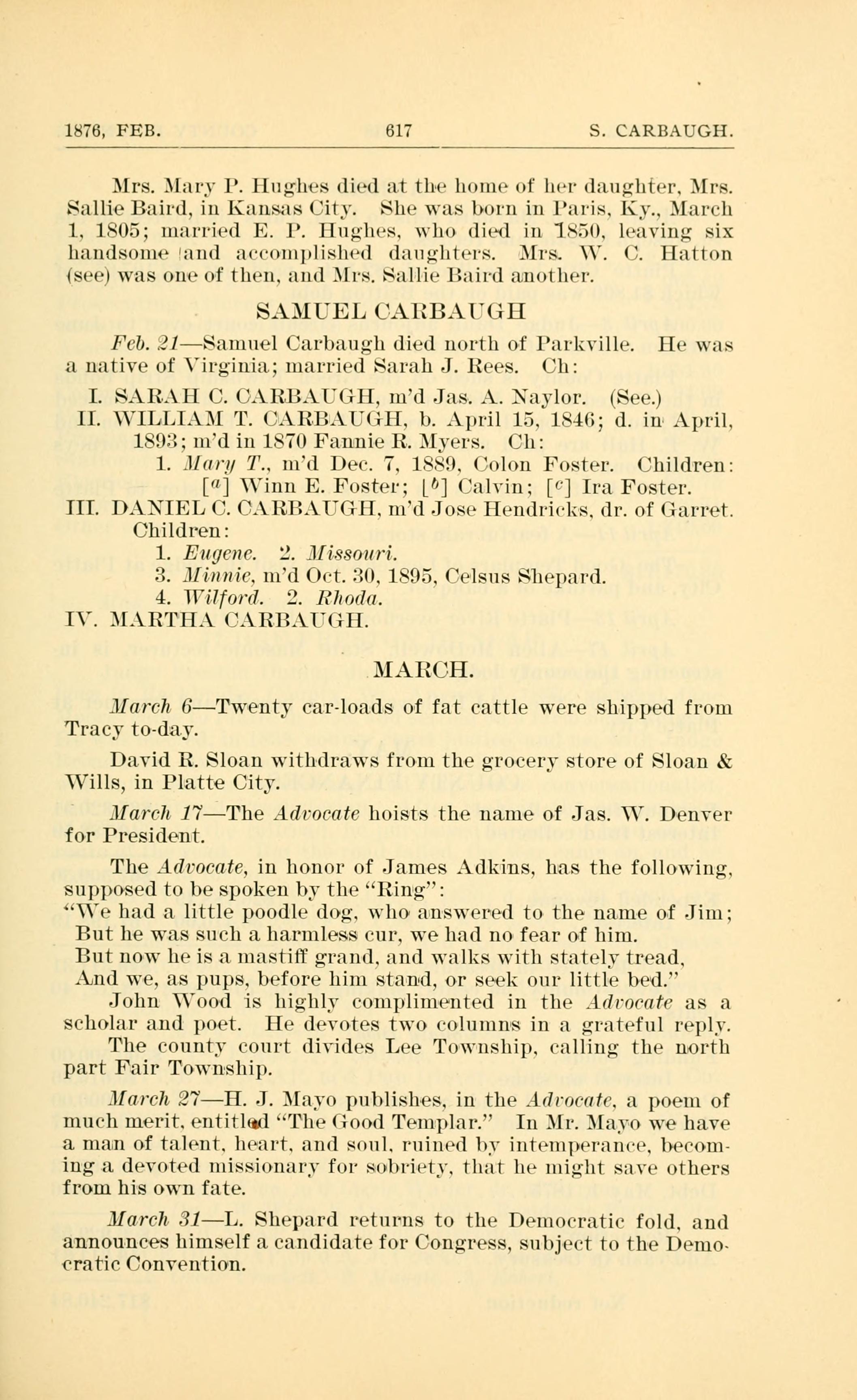 Feb. .21 Samuel Carbangh died north of Parkville. He was