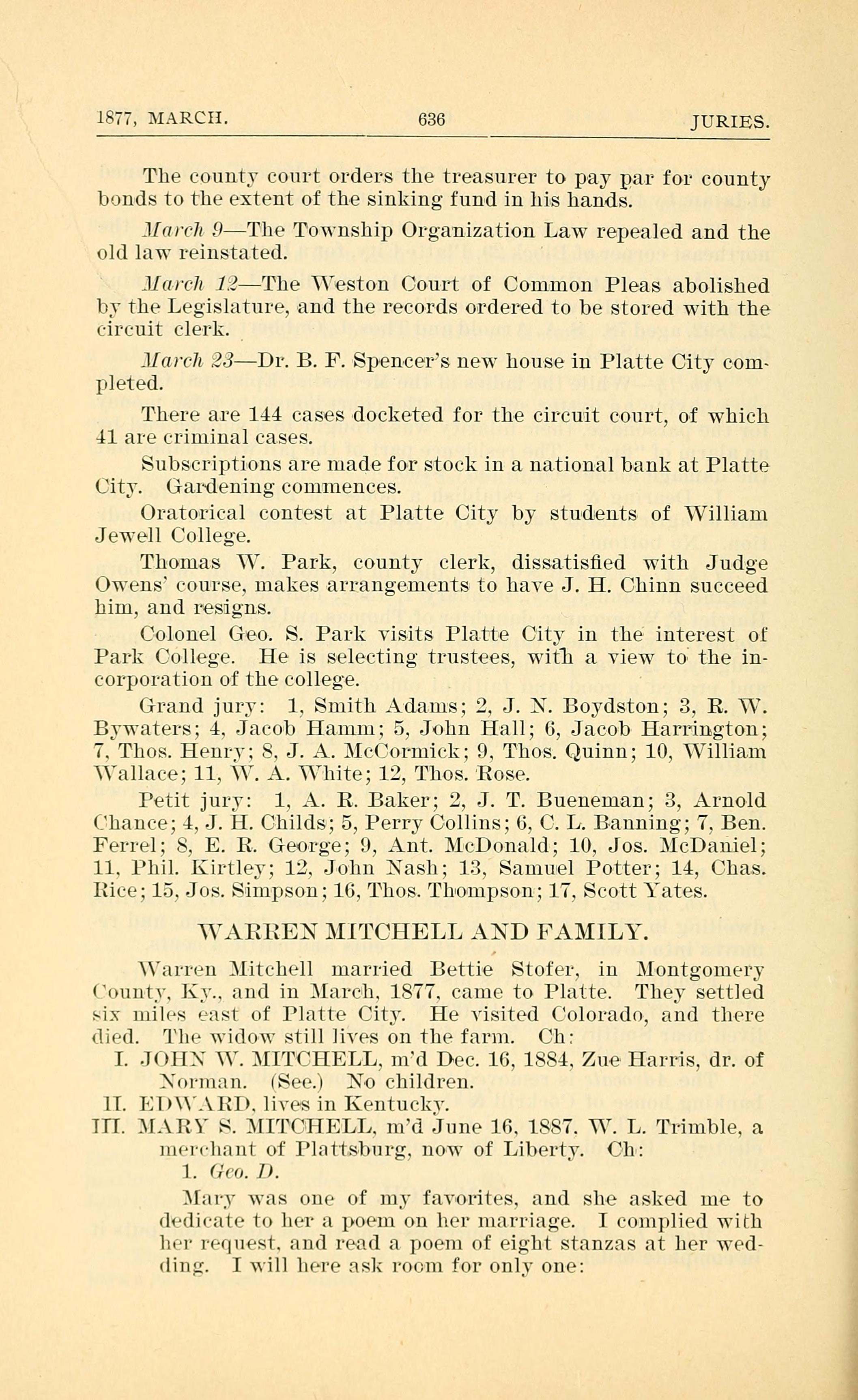 Warren Mitchell married Bettie Stofer, in Montgomery County, KY and in March. 1877. came to Platte. They settled six miles east of Platte City. He visited Colorado, and there died. The widow still lives on the farm. Children:
