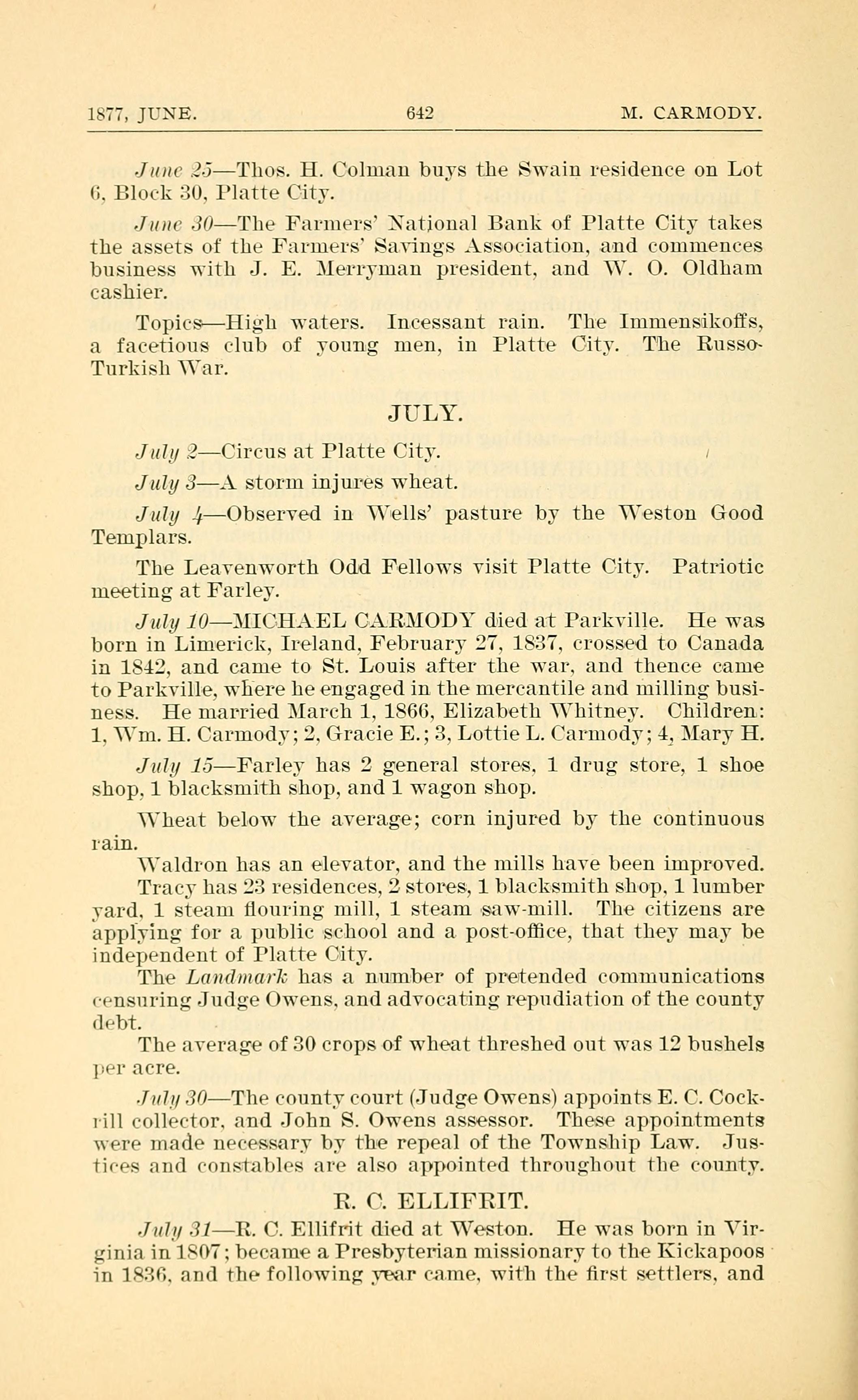 June 25 Thos. H. Colman buys the Swain residence on Lot 6, Block 30, Platte City.