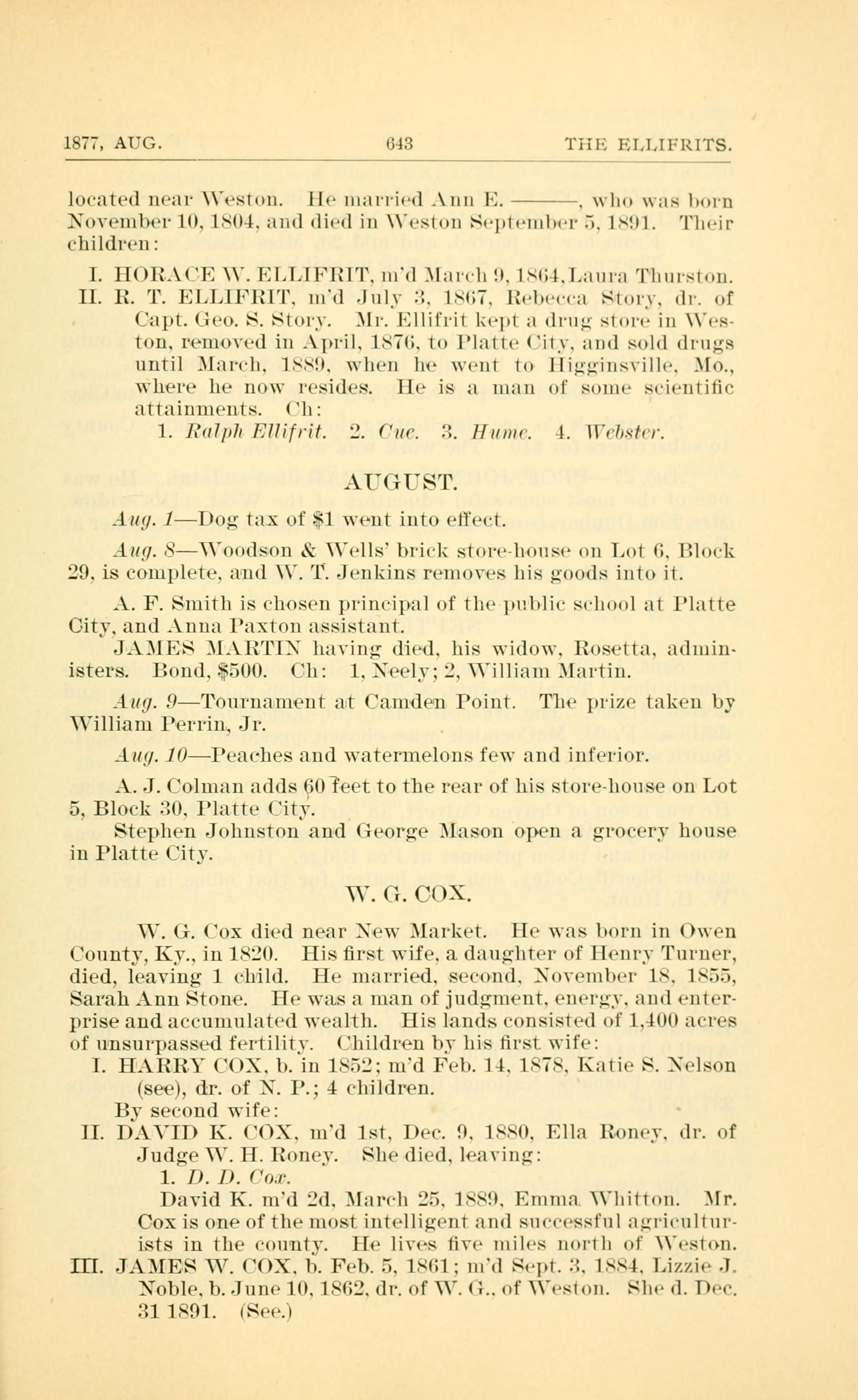 II. R. T. ELLIFRIT, m'd July 3, 1867, Rebecca Story, dr. of Capt. George S. STory. Mr. Ellifrit kept a drug store in Weston, removed in April, 1876, to Platte City, and sold drugs until March, 1889, when he went to Higginsville, MO., where he now resides. He is a man of some scientific attainments. Children: