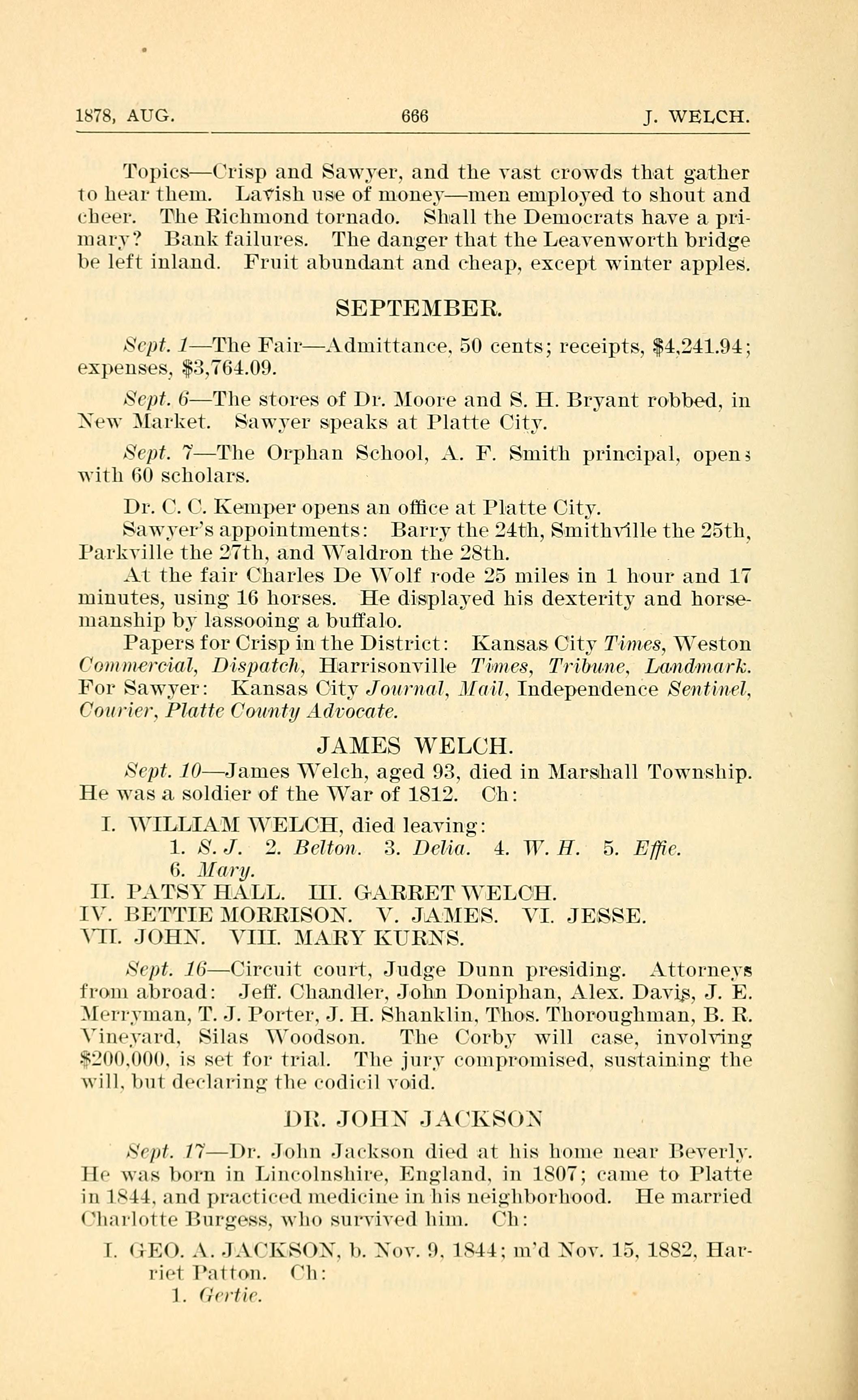 Sept. 17 - Dr. John Jackson died at his home near Beverly. He was born in Lincolnshire, England, in 1807; came to Platte in 1844, and practiced medicine in his neighborhood. He married Charlotte Burgess, who survived him. Children: