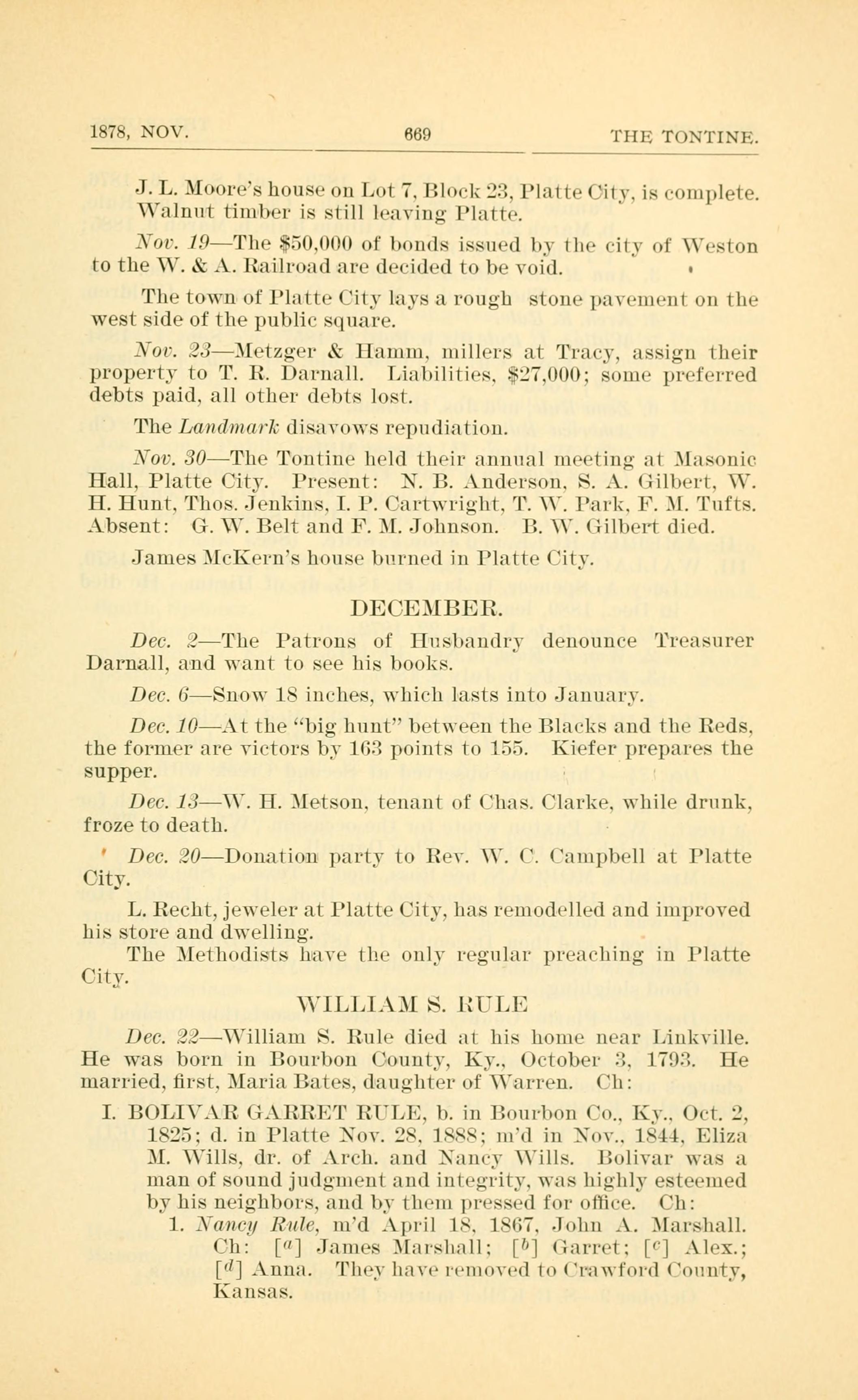 I. BOLIVAR GARRET RULE, b. in Bourbon County, Ky., Oct. 3, 1825: d. in Platte Nov. 28, 1888; married in Nov. 1844. Eliza M. Wil1s, daughter of Arch. and Nancy Wills. Bolivar was a man of sound judgment and integrity, was highly esteemed by his neighbors, a11d by them pressed for office. Children: