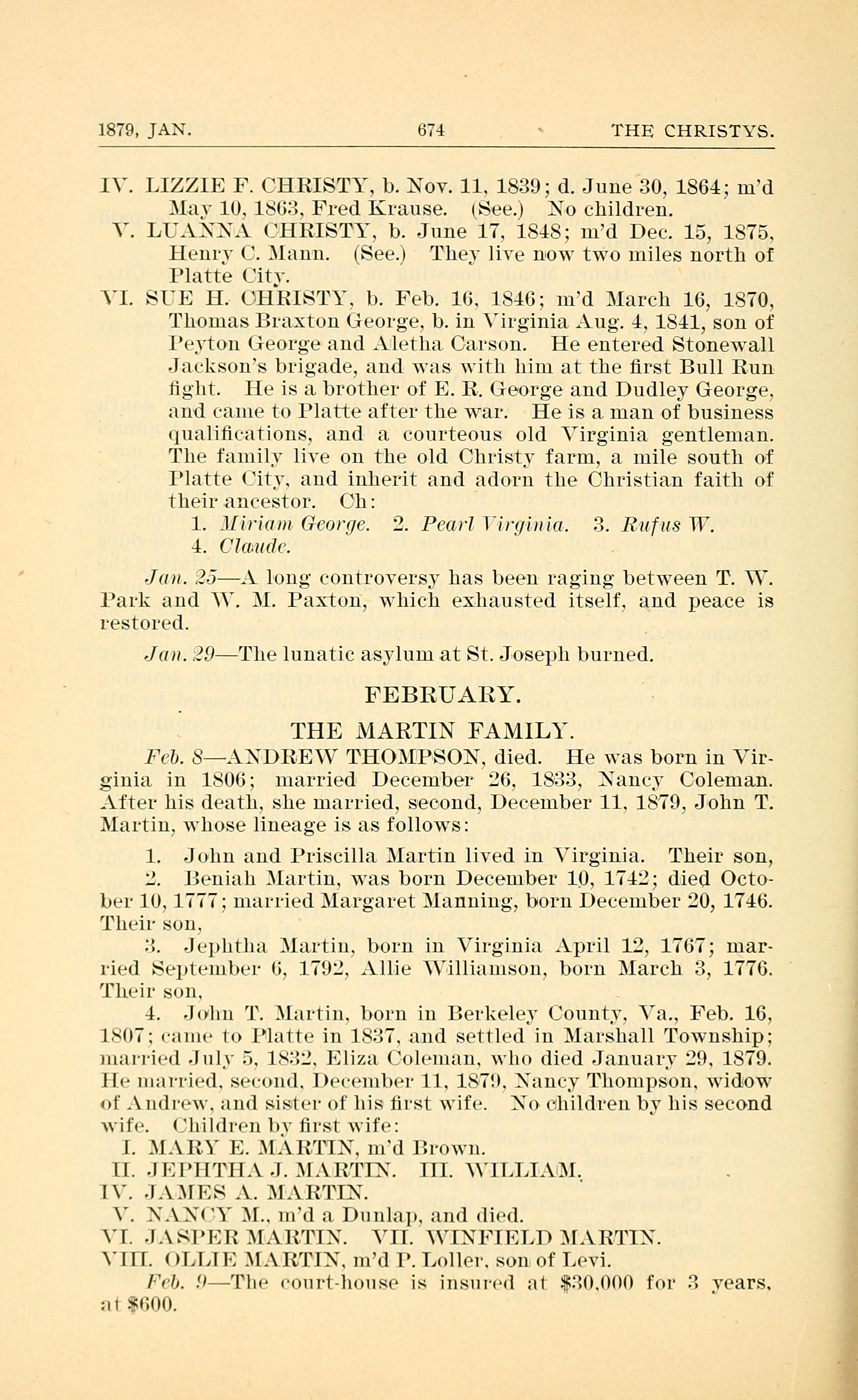 Feb. 8 - ANDREW THOMPSON, died. He was born in Virginia in 1806; married December 26, 1833; Nancy Coleman. After his death, she married, second, December 11, 1879, John T. Martin, whose lineage is as follows: