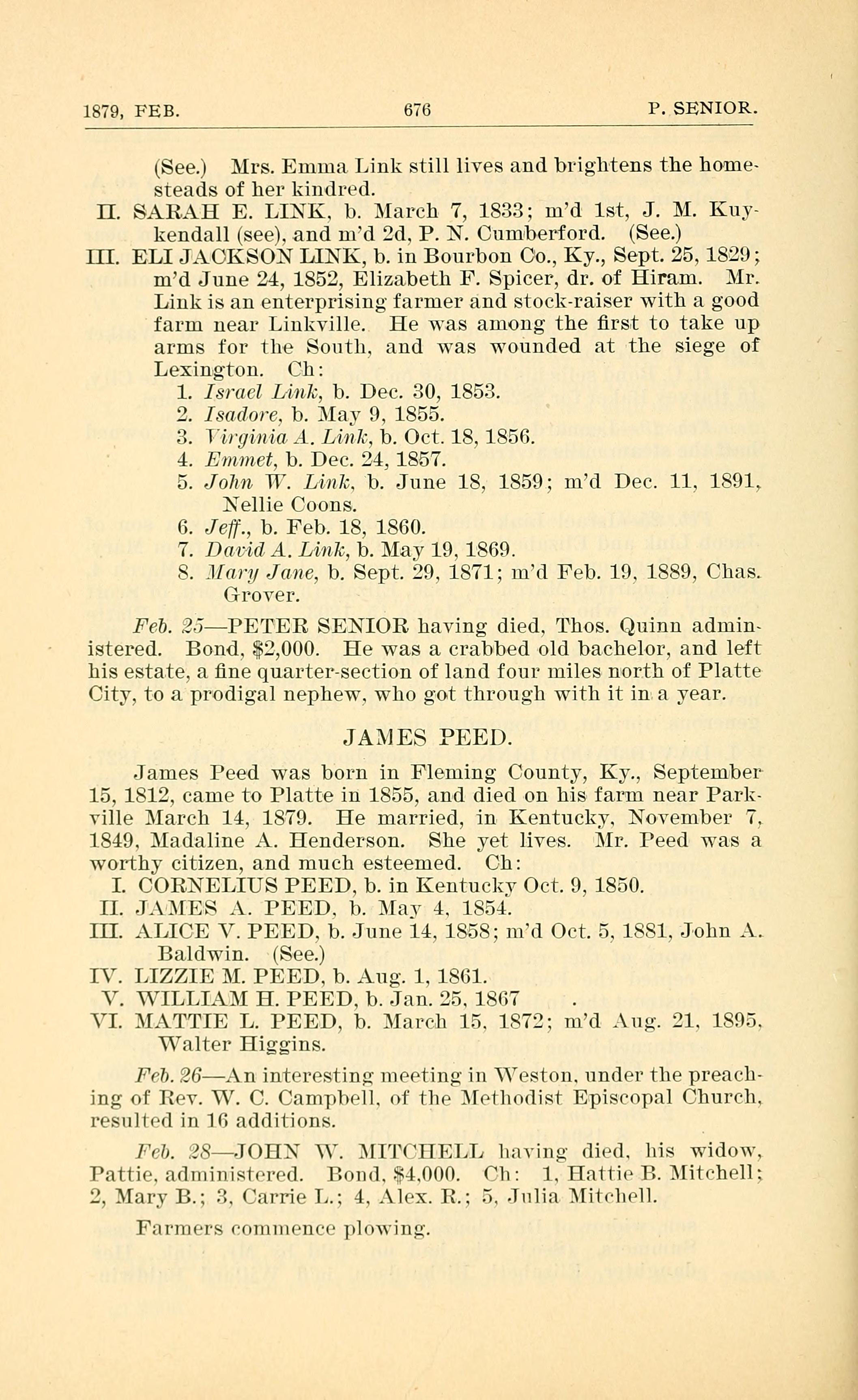 I. CORNELIUS PEED, b. in Kentucky Oct. 9, 1850.