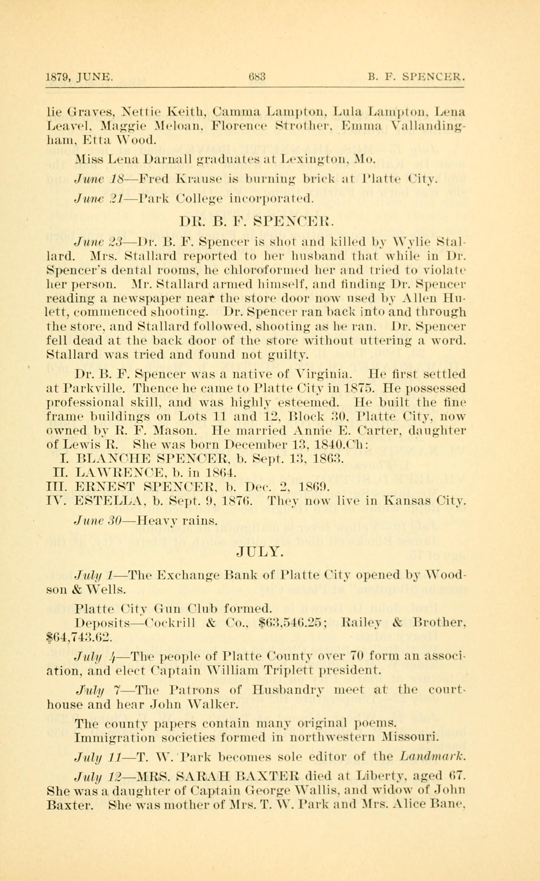 June 23 - Dr. B. F. Spencer is shot and killed by Wylie Stallard. Mrs. Stallard reported to her husband that while in Dr. Spencer's dental rooms, he chloroformed her and tried to violate her person. Mr. Stallard armed himself, and finding Dr. Spencer reading a newspaper near the store door now used by Allen Hulett, commenced shooting. Dr. Spencer ran back into and through the store, and Stallard followed, shooting as he ran. Dr. Spencer fell dead at the back door of the store without uttering a word. Stallard was tried and found not guilty.