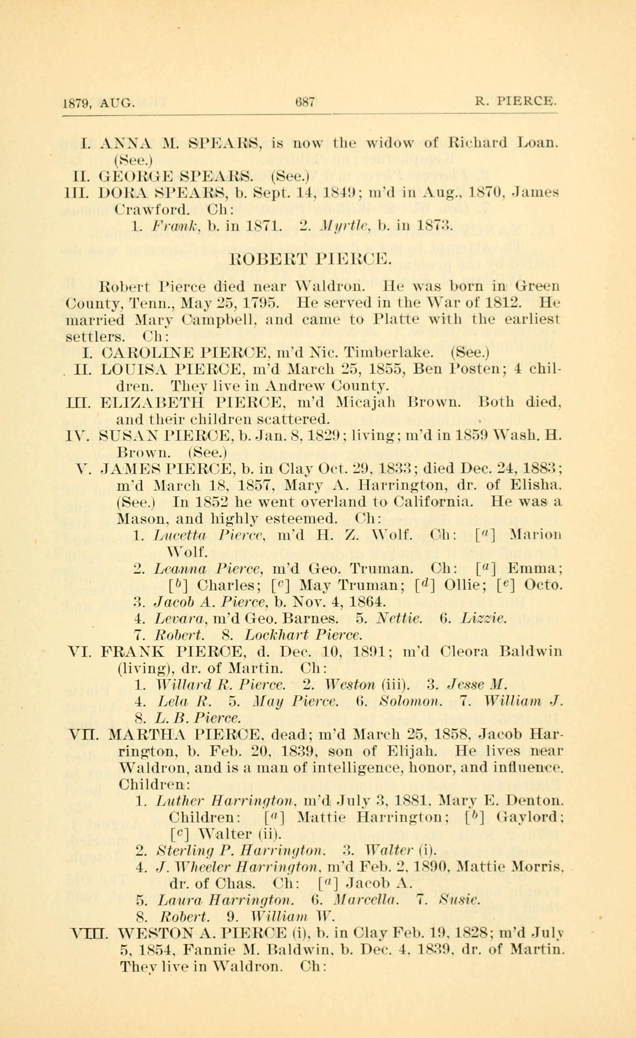 VII. MARTHA PIERCE, dead; married March 25, 1858, Jacob Harrington, b. Feb. 20, 1839, son of Elijah Harrington. He lives near Waldron, and is a man of intelligence, honor, and influence. Chidlren: