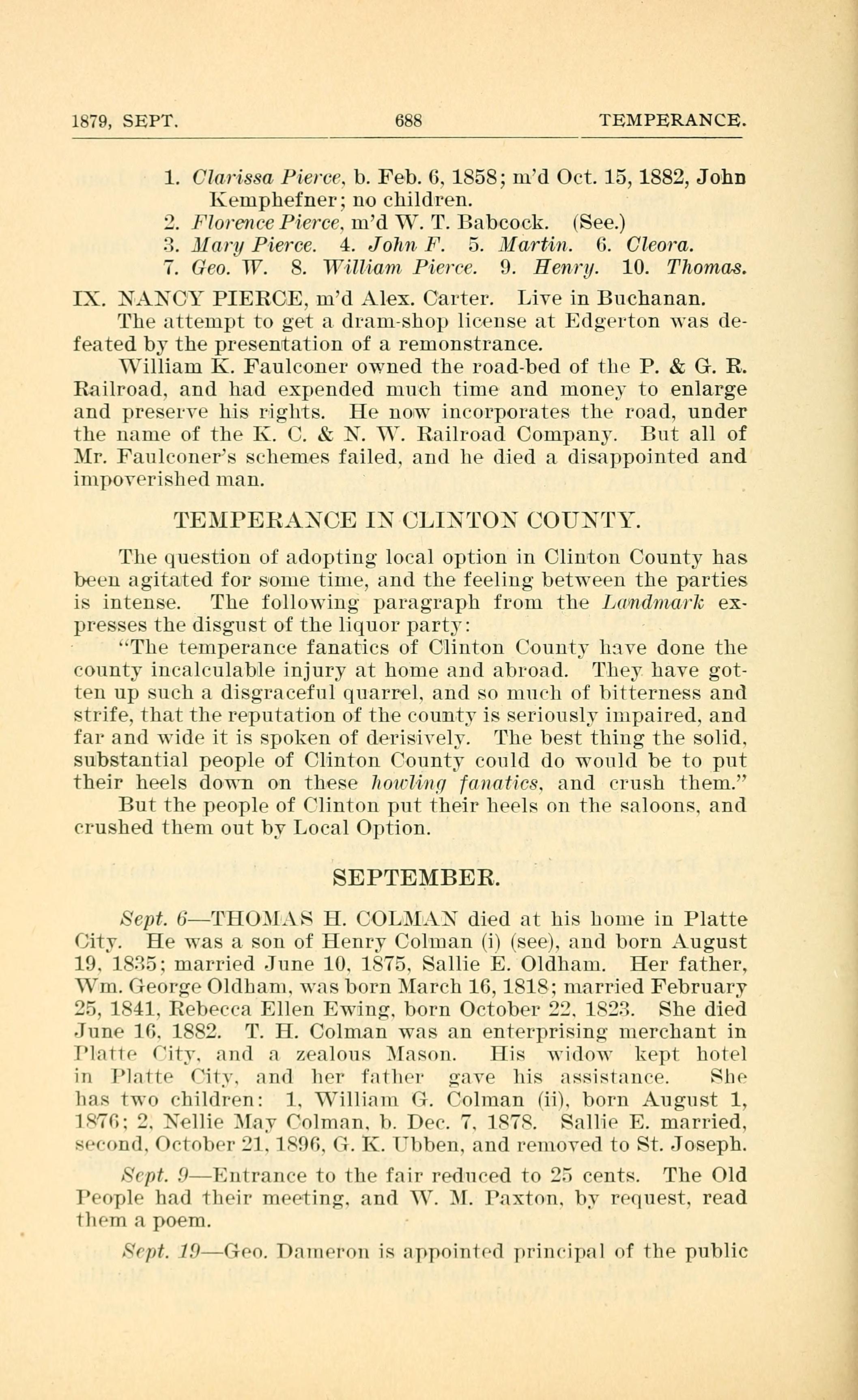 Sept. 6THO.l.S H. COLMAN died at his home in Platte