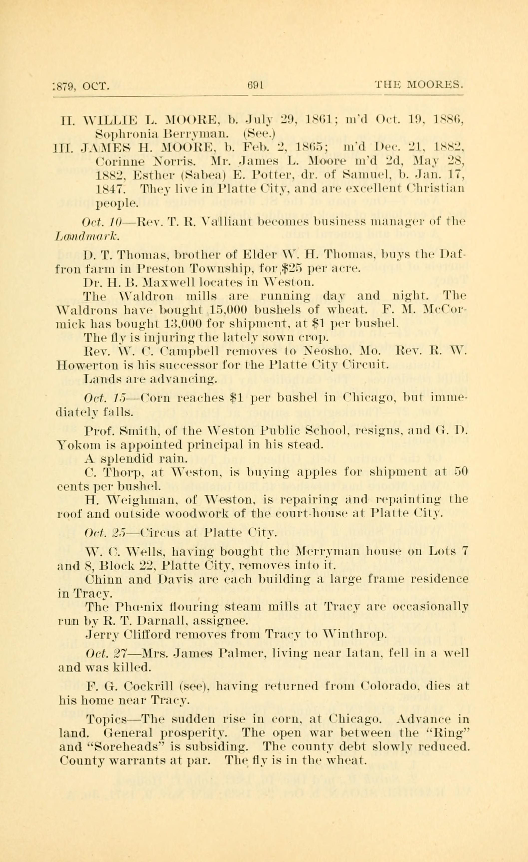 III. JAMES H. MOORE, b. Feb 2, 1865; m'd Dec. 21, 1882, Corinne Norris. Mr. James L. Moore m'd 2d, May 28 1882, Ester (Sabea) E. Potter, dr. of Samuel, b. Jan. 17, 1847. They live in Platte City, and are excellent Christian people.