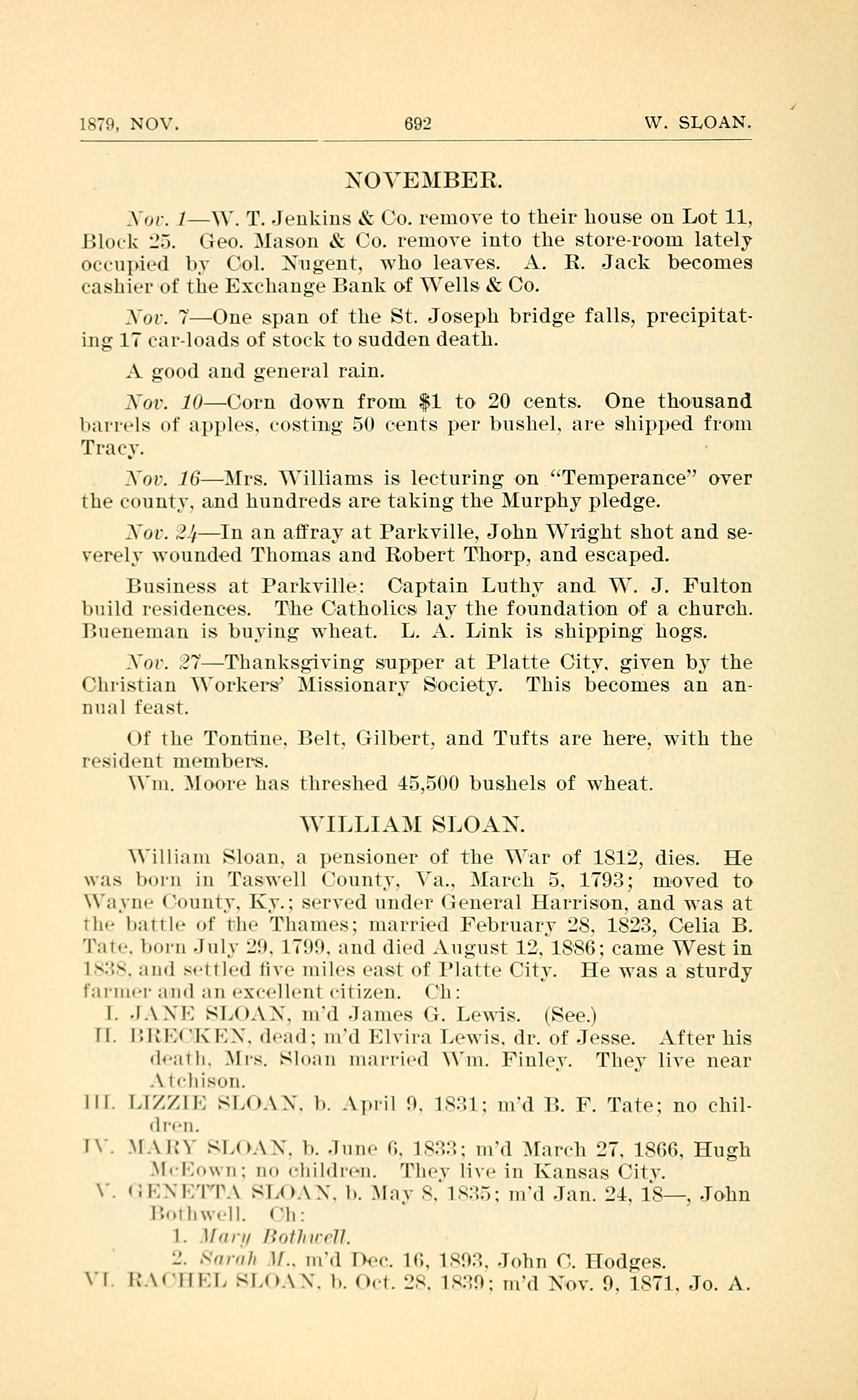 William Sloan, a pensioner of the War of 1812, dies. He was born in Taswell County, Va., March 5, 1793; moved to Wayne County, Ky.; served under General Harrison, andwas at the battle of the Thames; married February 28, 1823, Celia B. Tate, born July 29, 1799, and died August 12, 1886; came West in 1838, and settled five miles east of Platte City. He was a sturdy farmer and an excellent citizen. Children: