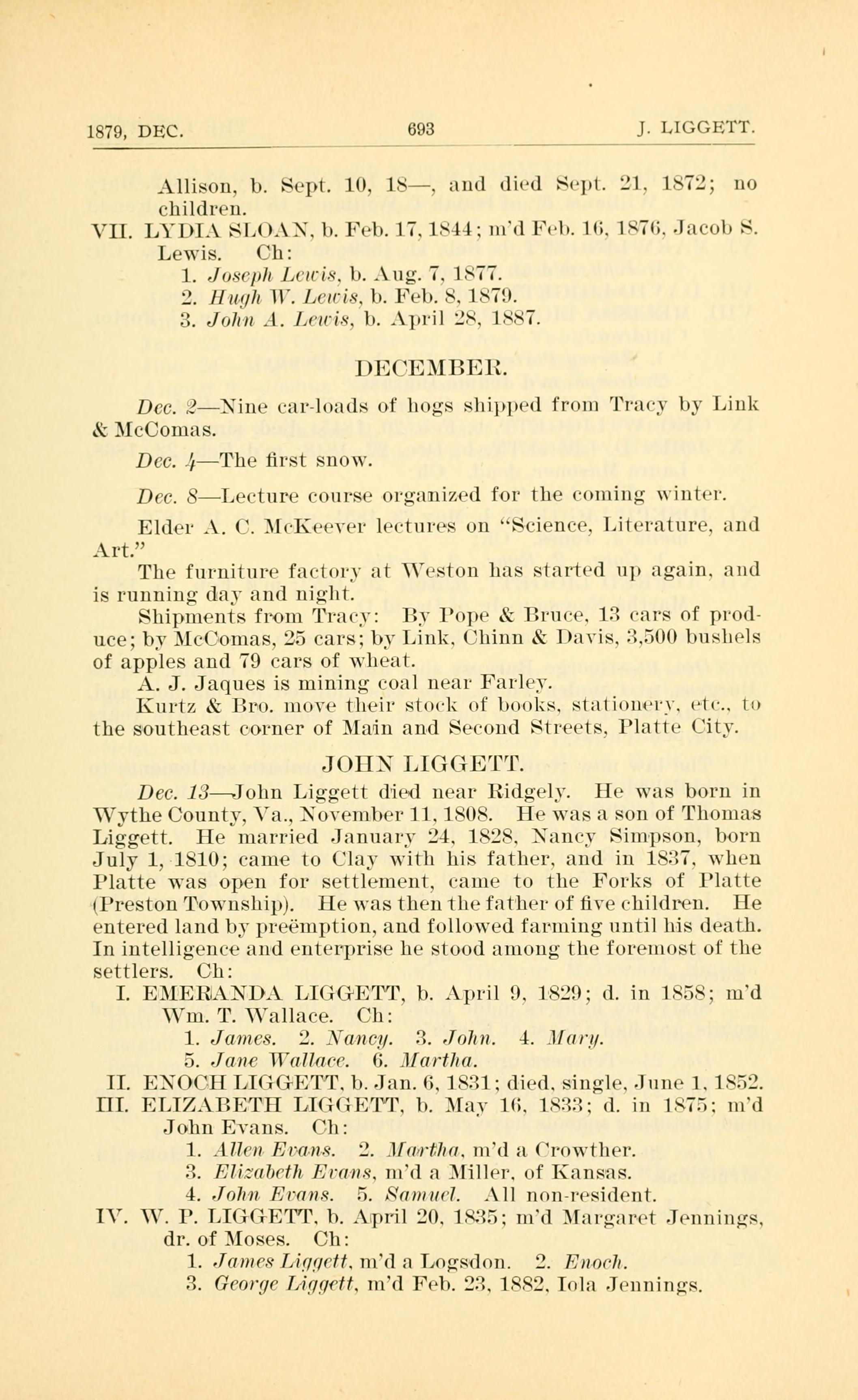Dec. 13John Liggett died near Ridgelv. He was born in