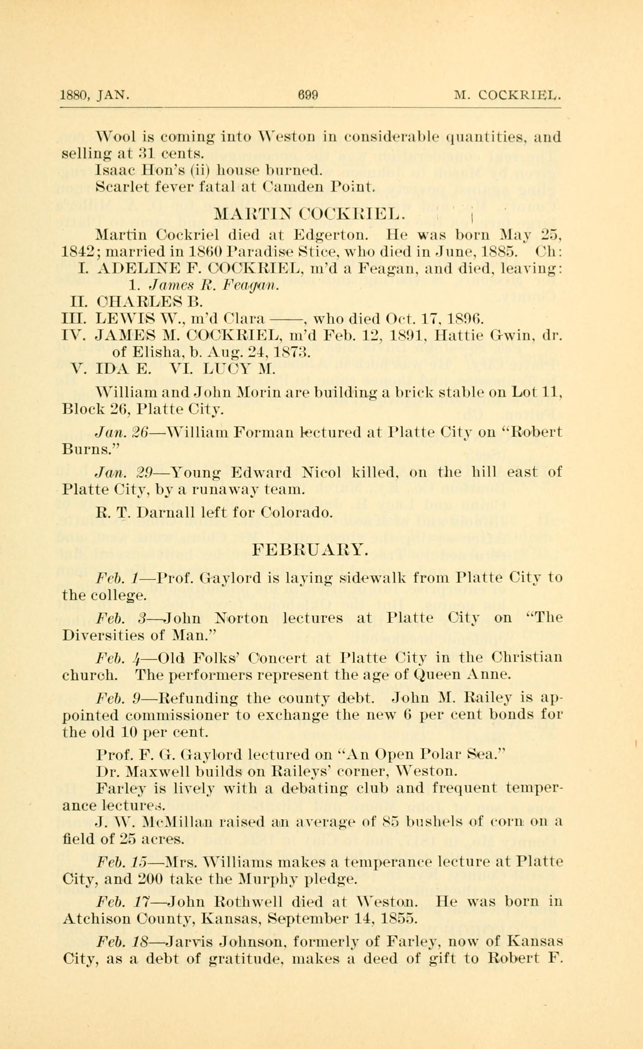 Martin Cockriel died at Edgerton. He was born May 25, 1842; married in 1860 Paradise Stice, who died in June, 1885. Children: