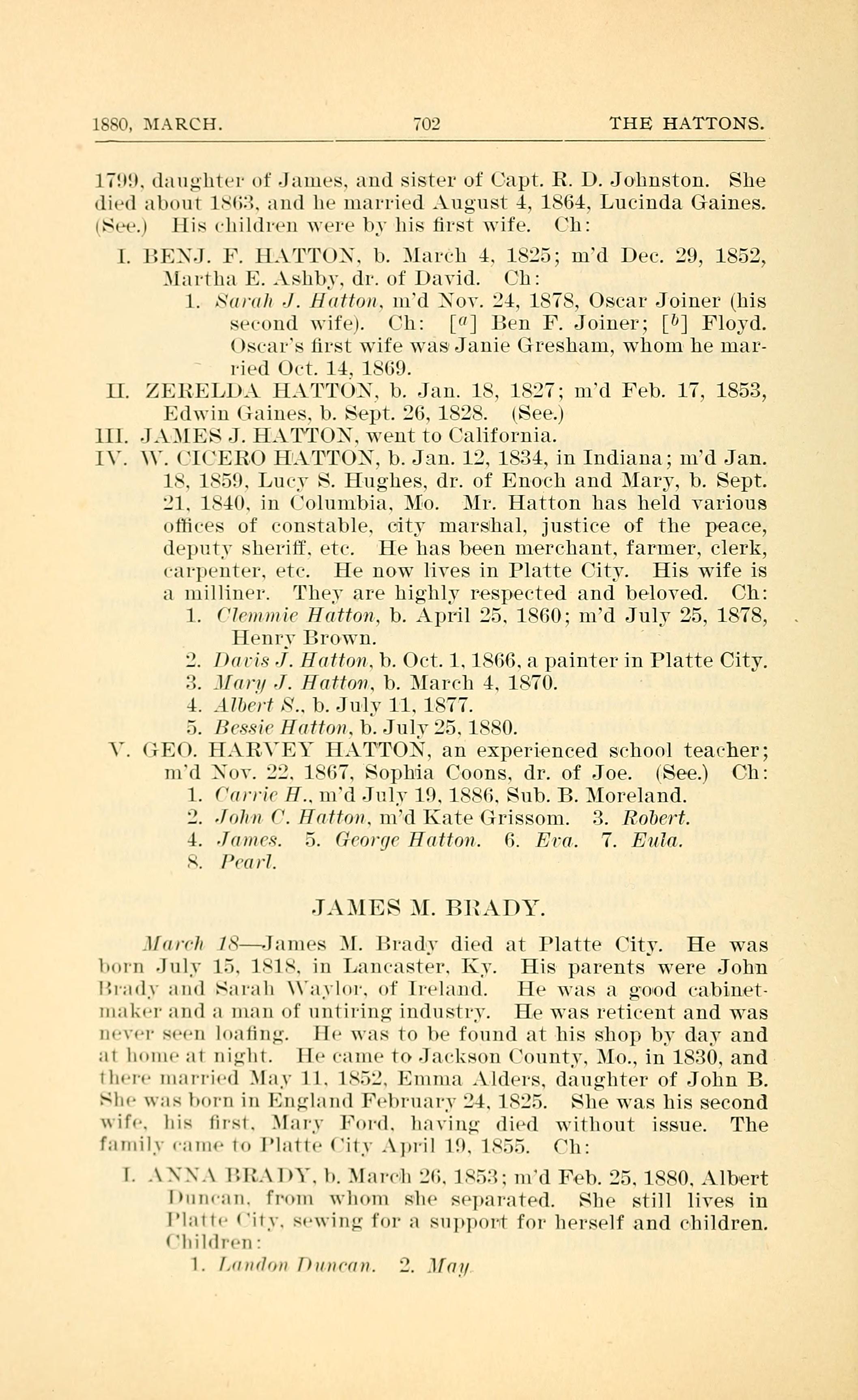 March 18 - James M. Brady died at Platte City. He was born July 15, 1818, in Lancaster, Ky. His parents were John Brady and Sarah Waylor, of Ireland.