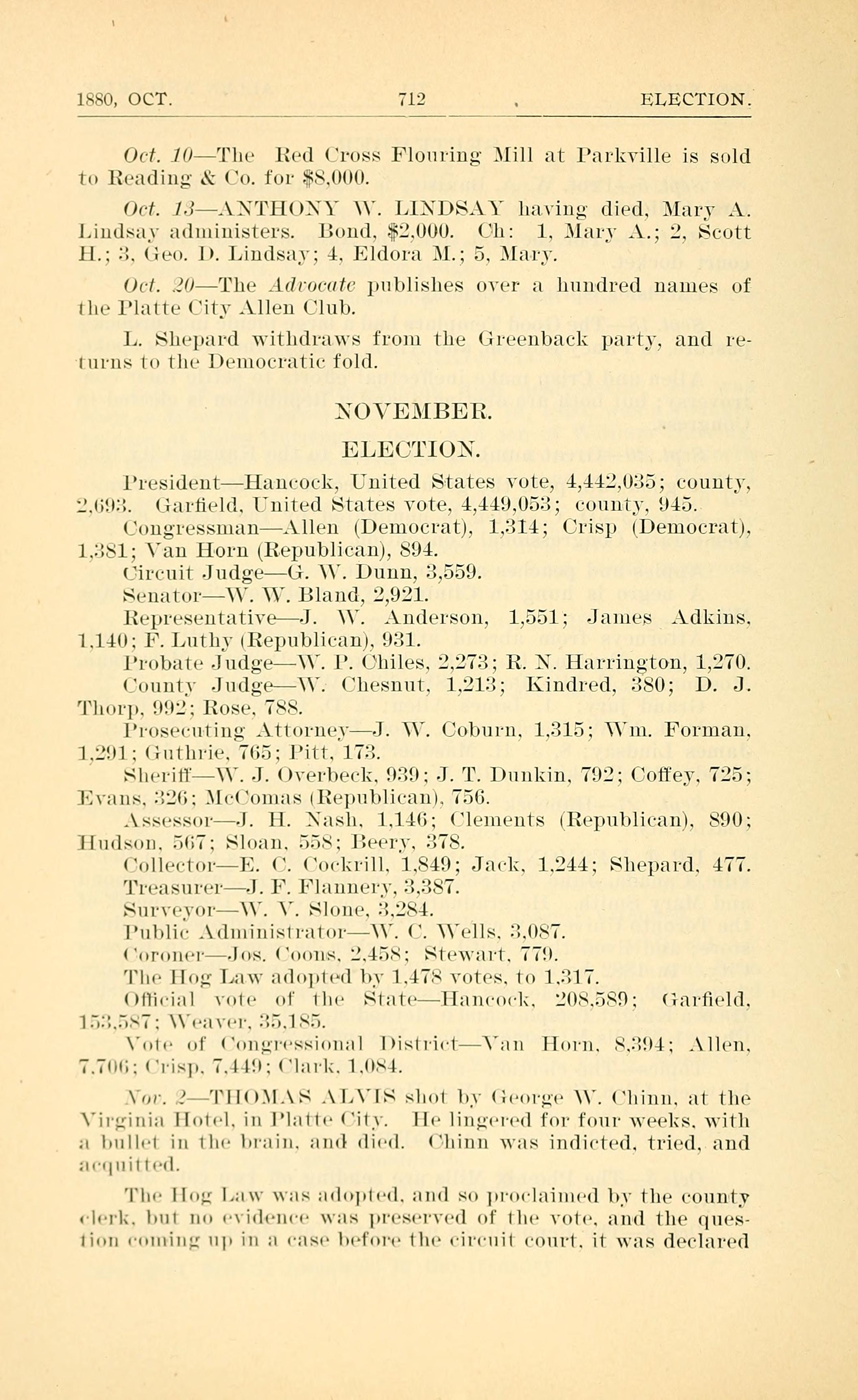NOV. 2 - THOMAS ALVIS shot by George W. Chinn, at the Virginia Hotel, in Platte City. He lingered for four weeks, with a bullet in the brain, and died. Chinn was indicted, tried and aquitted.