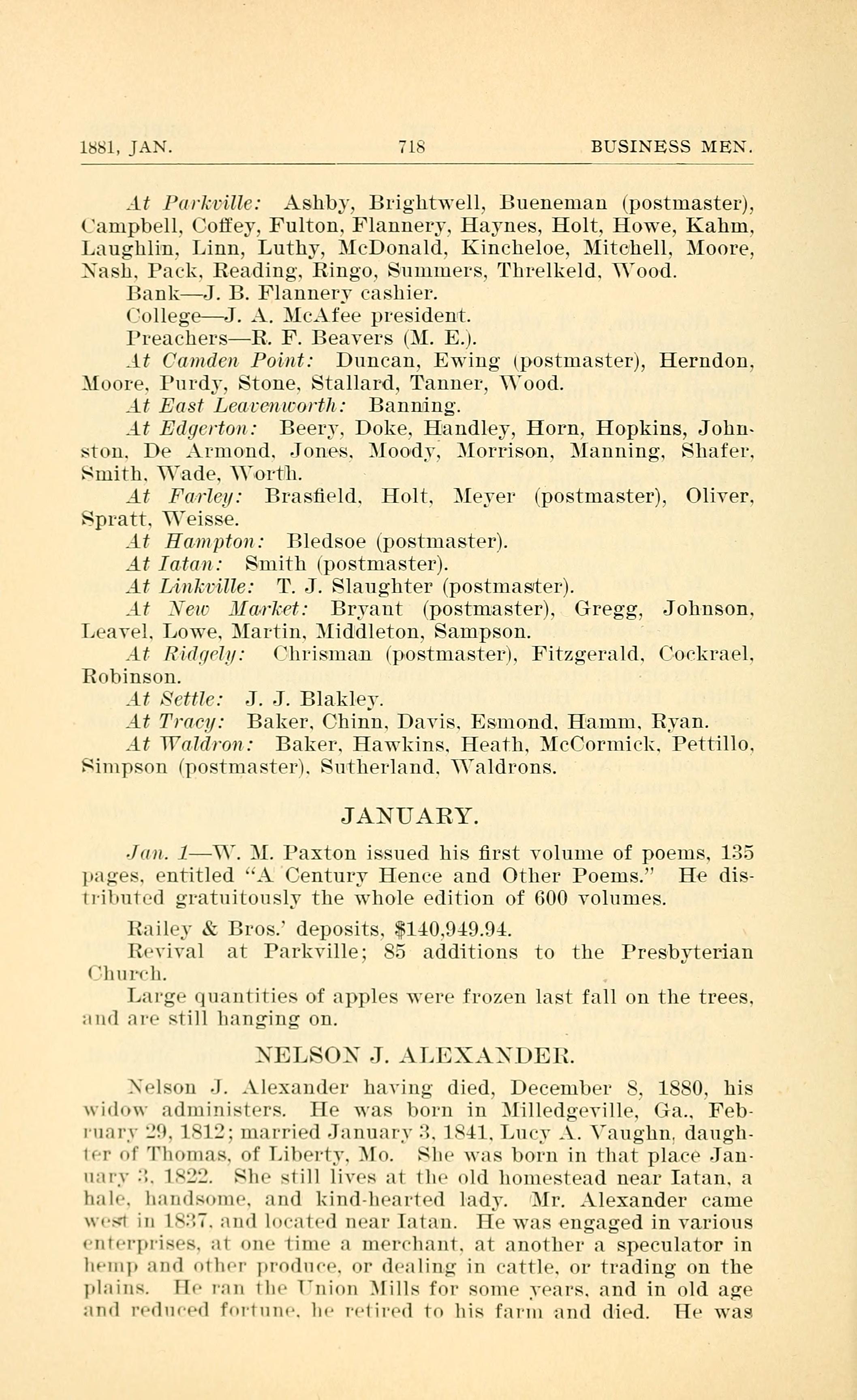 Nelson J. Alexander having died, December 8, 1880, his widow administers. He was born in Milledgeville, Ga., February 29, 1812; married January 3, 1841, Lucy A. Vaughn, daughter of Thomas Vaughn, of Liberty, Mo. She was born in that place January 3, 1822. She still lives at the old homestead near Iatan, a hale, handsome, and kind-hearted lady. Mr. Alexander came west in 1837, and located near Iatan. He was engaged in various enterprises, at one time a merchant, at another a speculator in hemp and other produce, or dealing in cattle, or trading on the plains. He ran the Union Mills for some years, and in old age and reduced fortune, he retired on his farm and died. He was