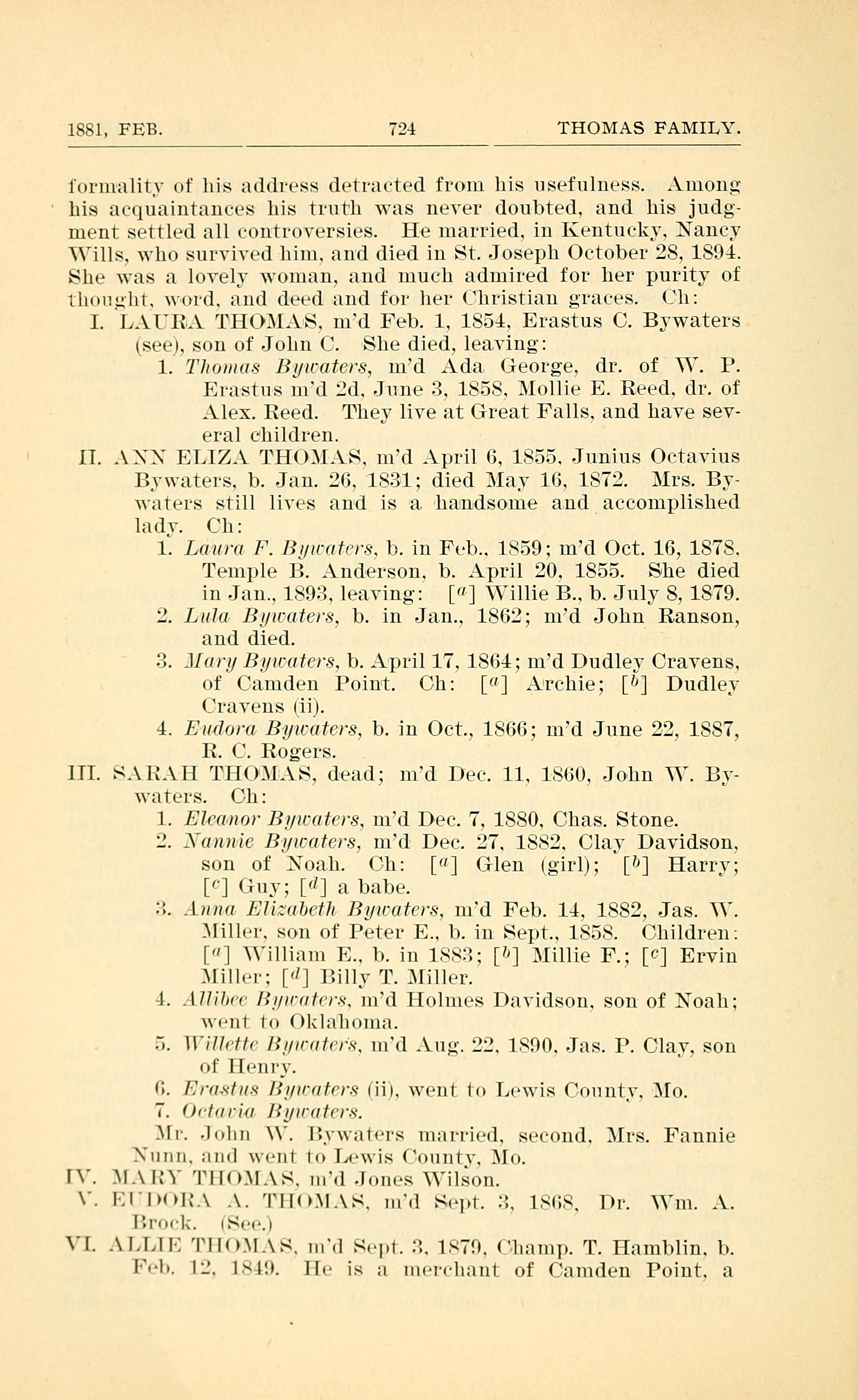 I. LAURA THOMAS, married Feb. 1, 1854, Erastus C. Bywaters, son of John C. Bywaters. She died leaving: