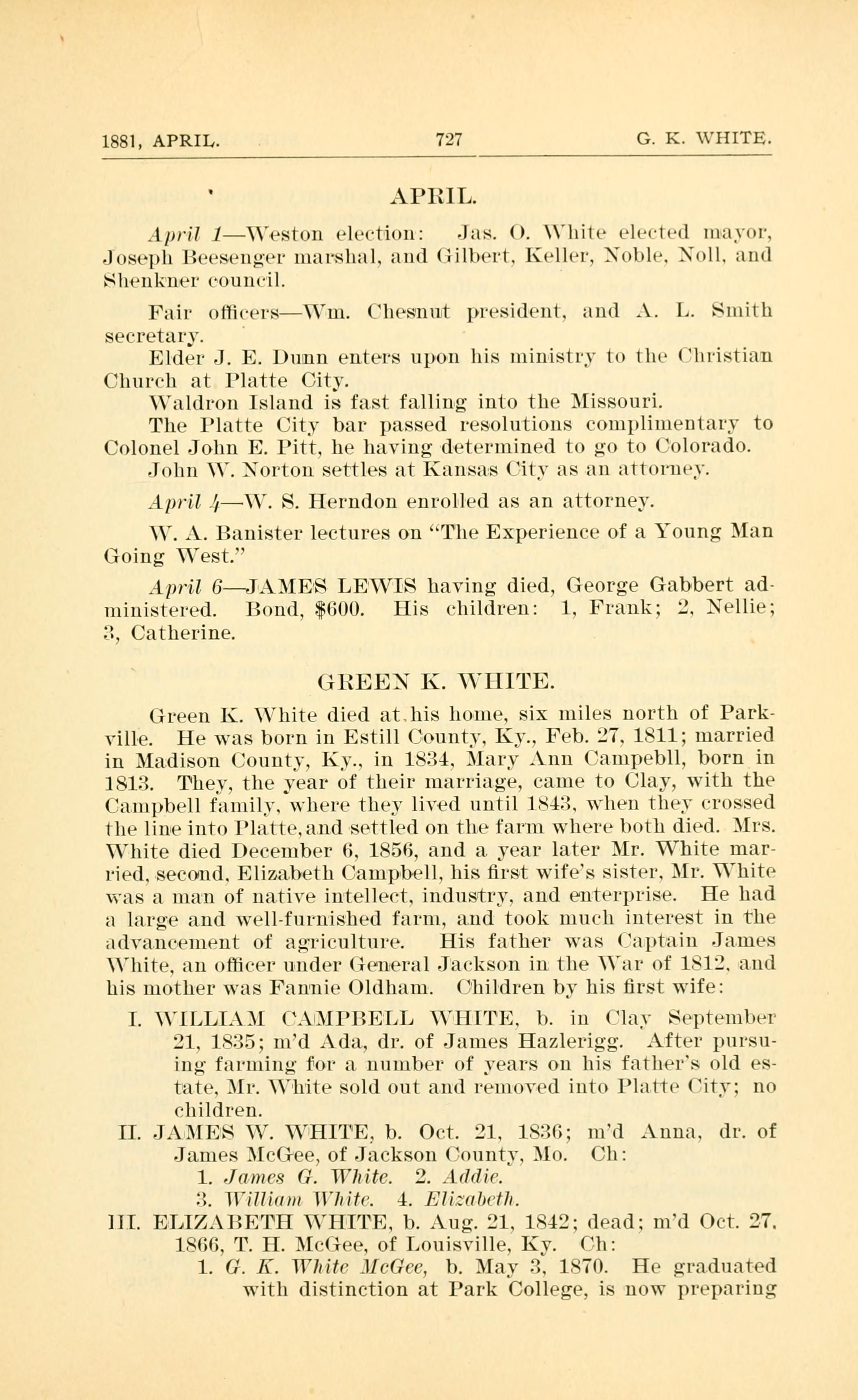 Green K. Vhite died at.his home, six miles north of Parkville. He was born in Estill County, KY., Feb. 27, 1811; married in Madison County, Ky. in 1834. Mary Ann Campbell, born in 1813. They, the year of their marriage. came to Clay, with the Campbell family, where they lived until 1843. when they crossed the line into Platte, settled on the farm where both died. Mrs. White died December 6, 1856, and a year later Mr. White married second, Elizabeth Campbell his first wifes sister. Mr. White was a main of native intellect, industry, and enterprise. He had a large and well-furnished farm, and took much interest in the advancement of agriculture. His father was Captain James White, a11 officer under General Jackson i11 the War of 1812. and