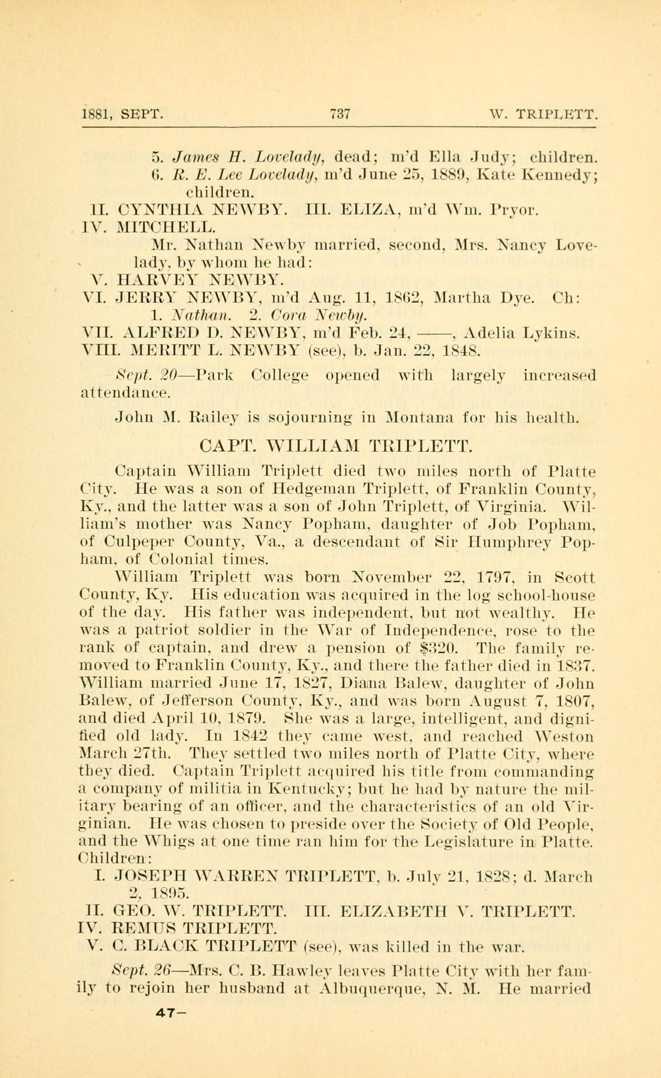 Sept. 26 - Mrs. C. B. Hawley leaves Platte City with her family to rejoin her husband at Albuquerque, N. M. He married