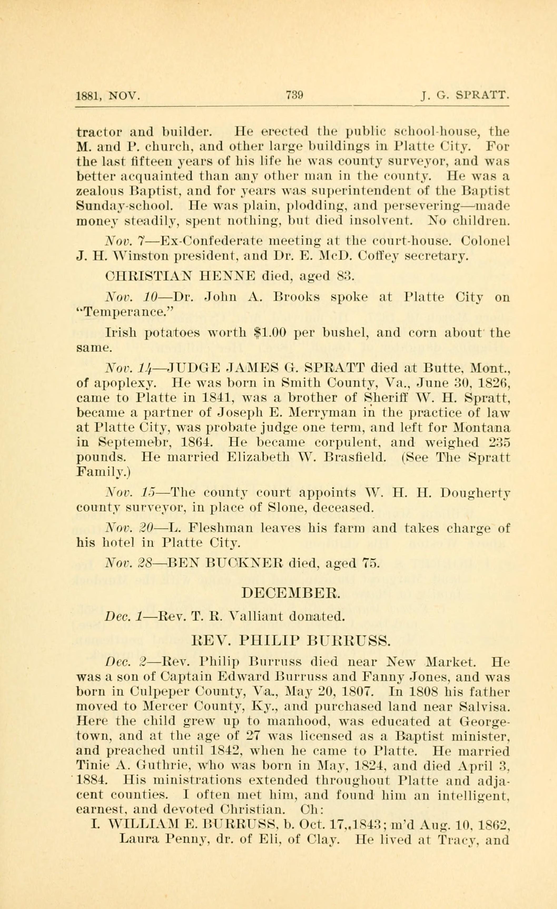 came to Platte in 1841. was a brother of Sheriff W. H. Spratt.