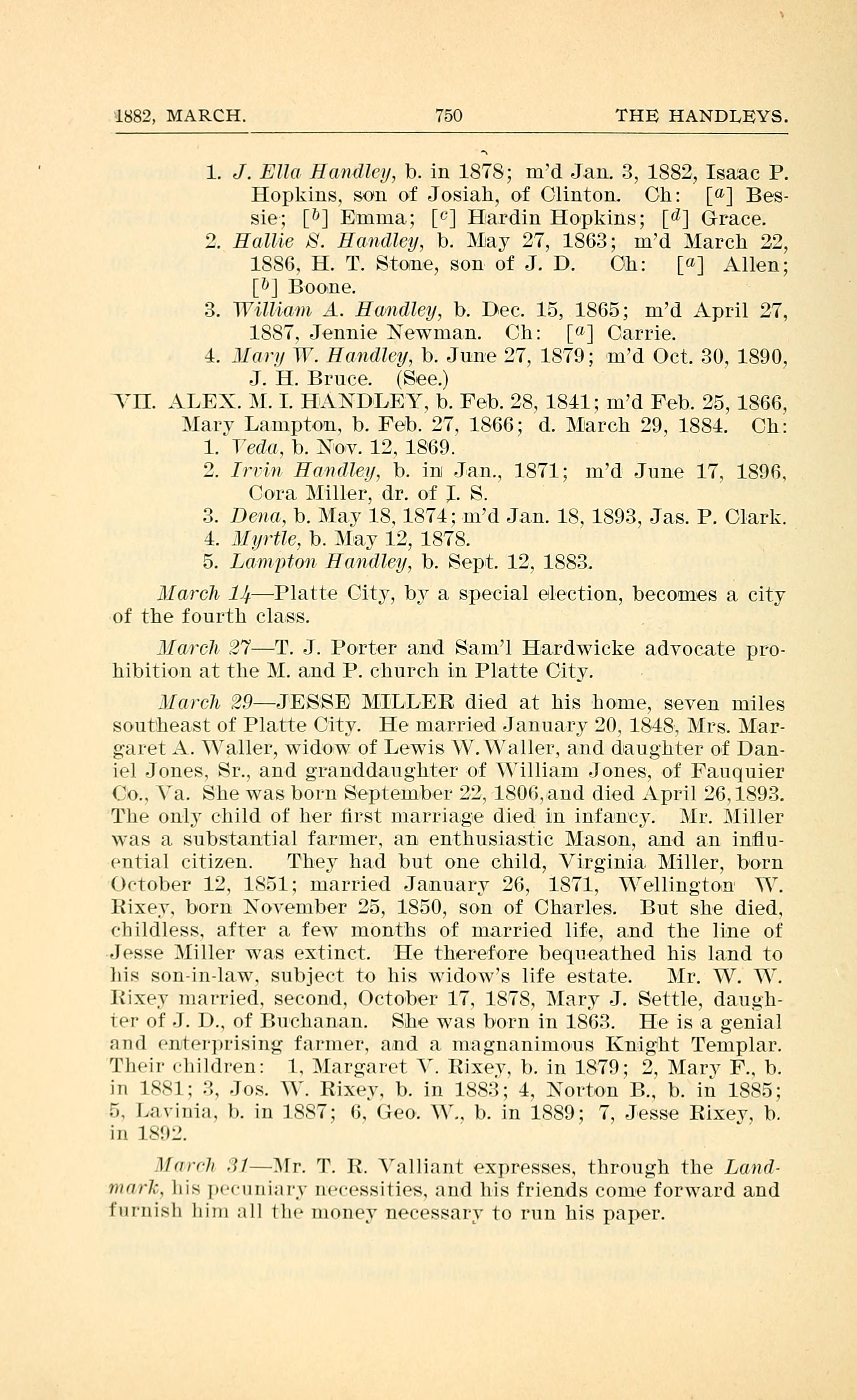 VII. ALEX. M. I. HANDLEY, b. Feb. 28, 1841; md Feb. 25, 1866,