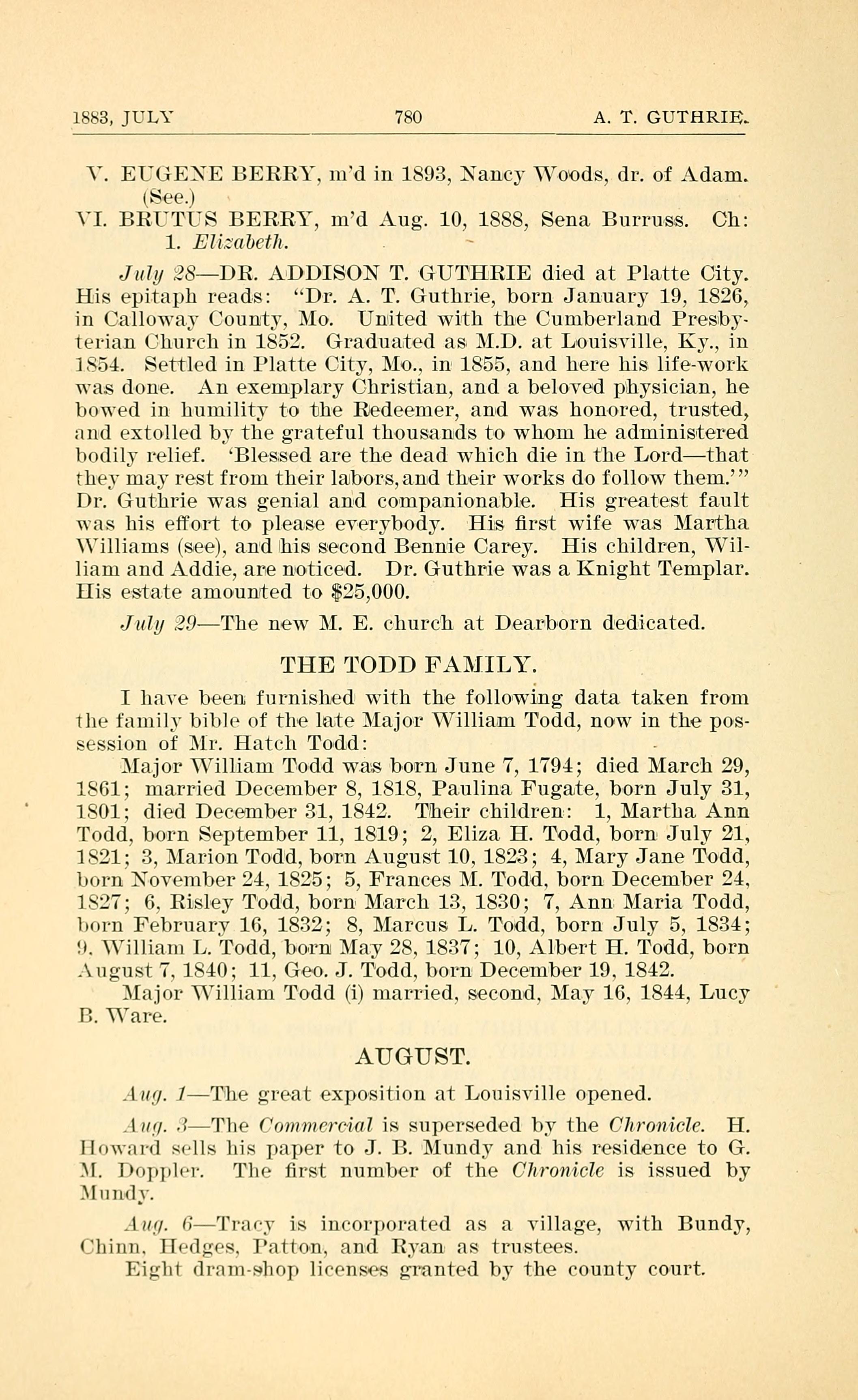J uly 28DR. ADDISON T. GUTHRIE died at Platte City.