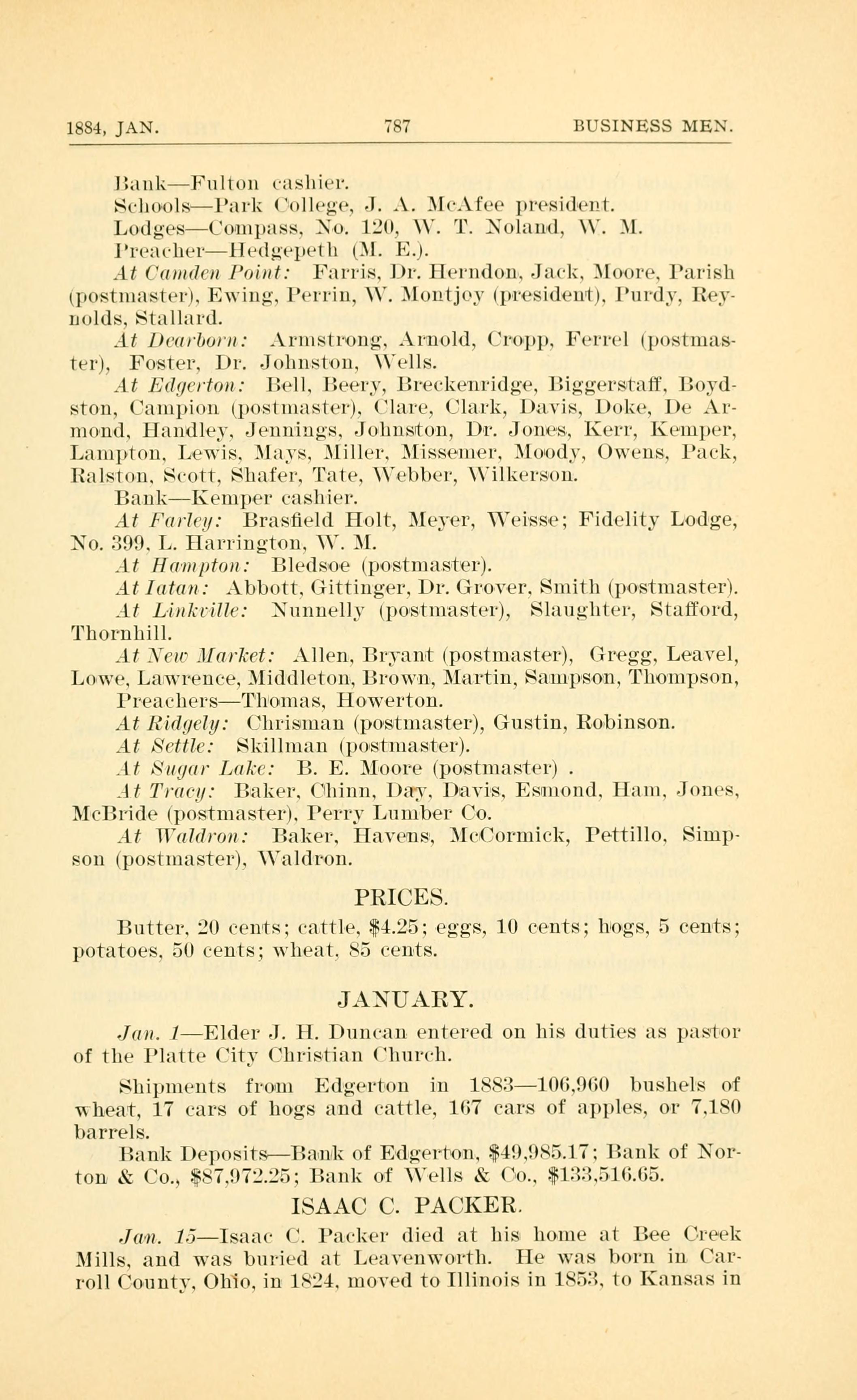Jan. 15 - Isaac C. Packer died at is home at Bee Creek Mills, and was buried at Leavenworth. He was born in Carroll County, Ohio, in 1824, moved to Illinois in 1853, to Kansas in