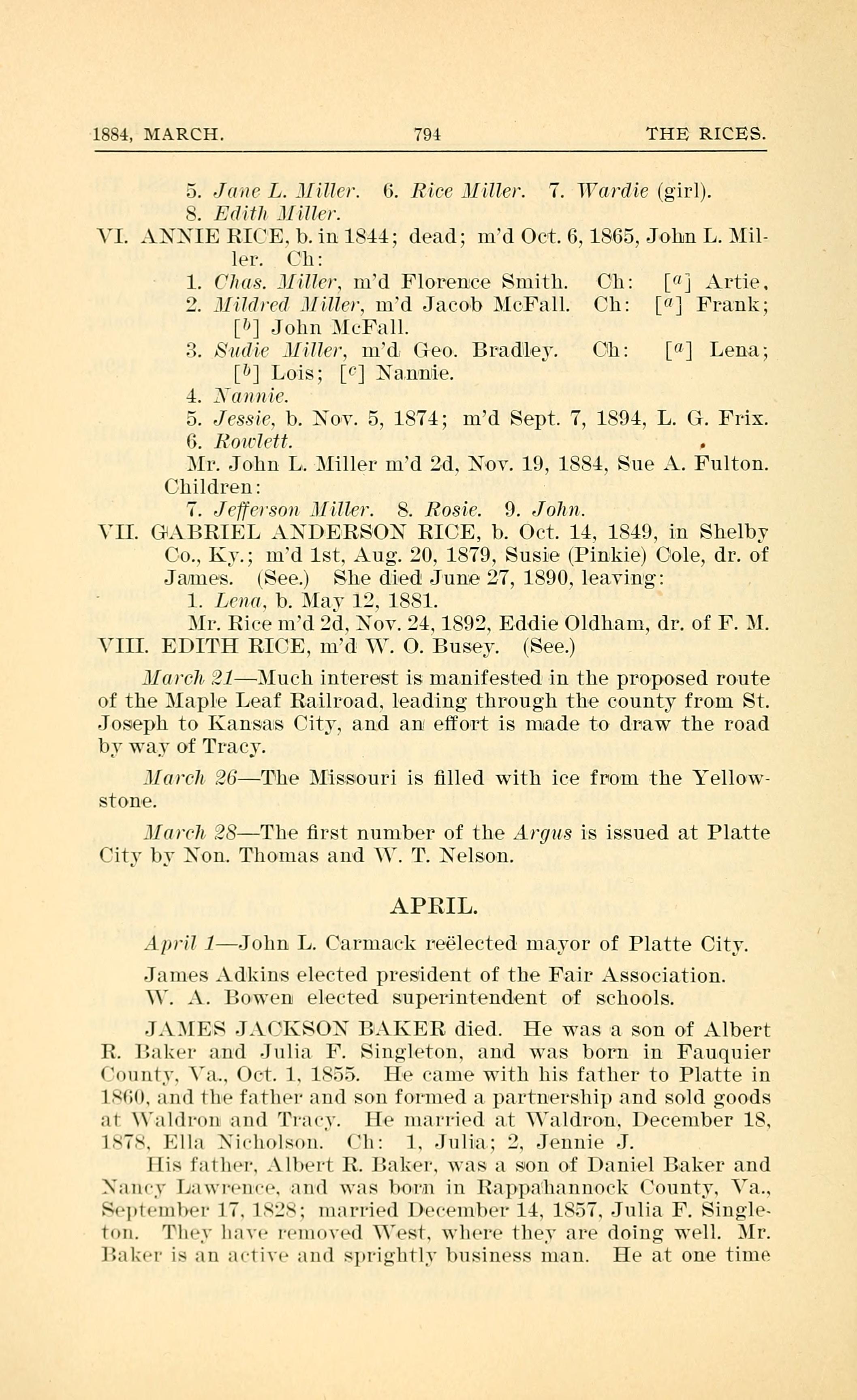 JAMES JACKSON BAKER died. He was a son of Albert R. Baker and Julia F. Singleton, and was born in Fauquier County, Va., Oct. 1, 1855. He came with his father to Platte in 1860, and the father and son formed a partnership and sold goods at Waldron and Tracy. He married at Waldron, December 18, 1878, Ella Nicholson. Children: