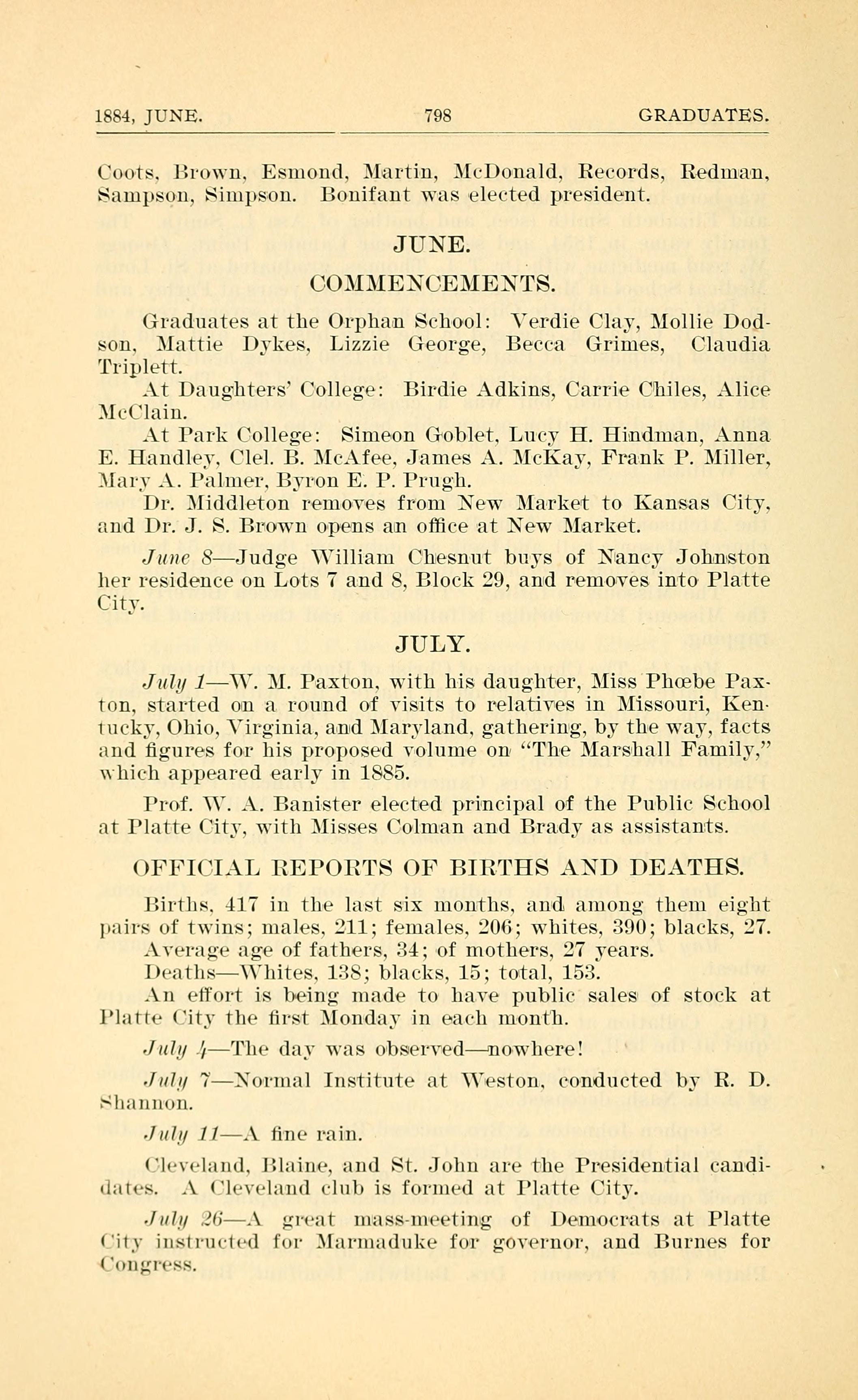 July 1 W. M. Paxton. with his daugliter, Miss Phoebe Paxton. started on a round of Visits to relatives in Missouri, Kentucky, Ohio, Virginia, and Maryland. gathering, by the way, facts and figures for his proposed Volume on The Marshall Family, which appeared early in 1885.