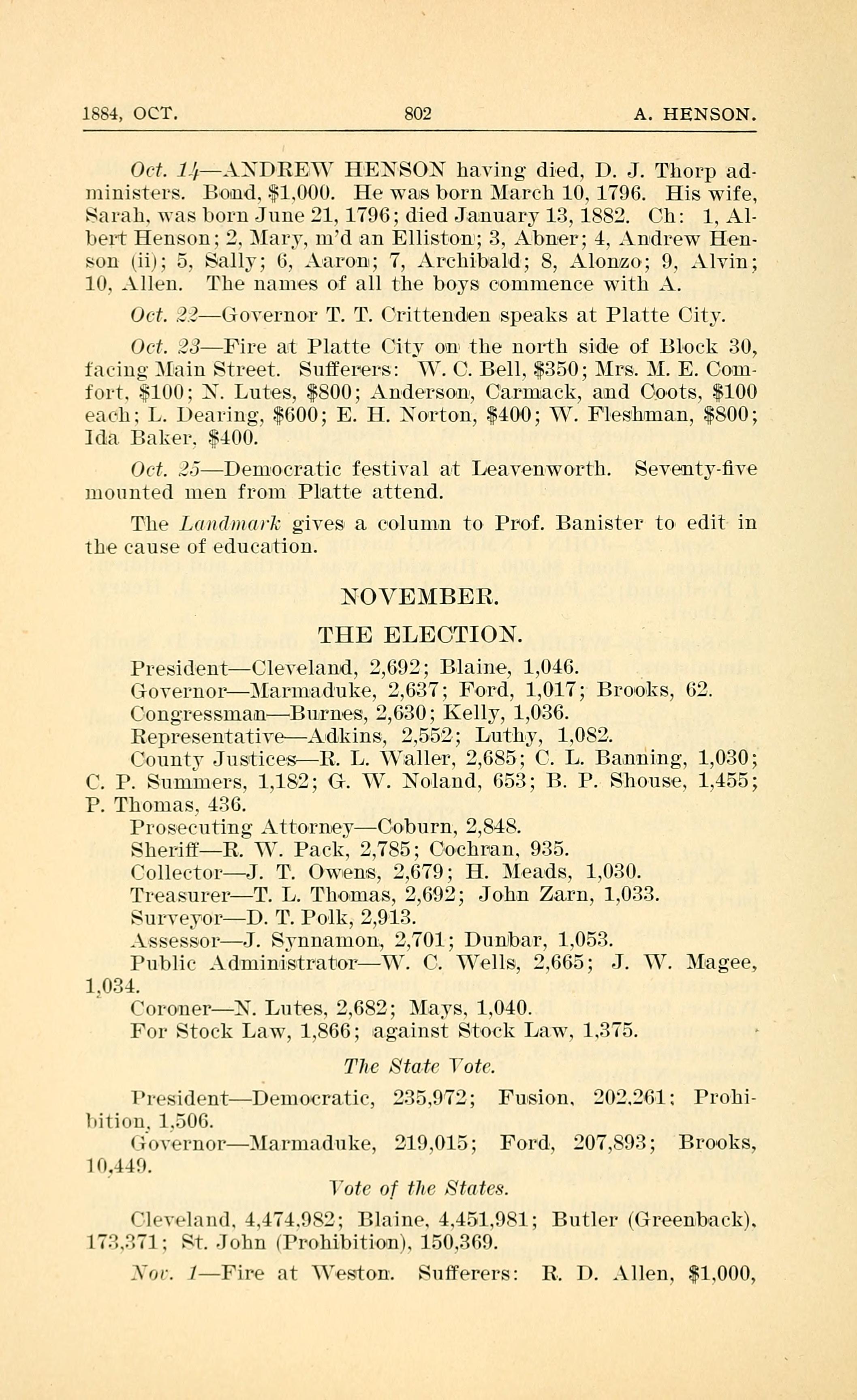 Oct. 23 - Fire at Platte City on the north side of Block 30, facing Main Street. Suffers: W. C. Bell, $350; Mrs. M. E. Comfort, $100; N. Lutes, $800; Anderson, Carmack, and Coots, $100 each; L. Dearing, $600; E. H. Norton, $400; W. Fleshman, $800; Ida Baker, $400.