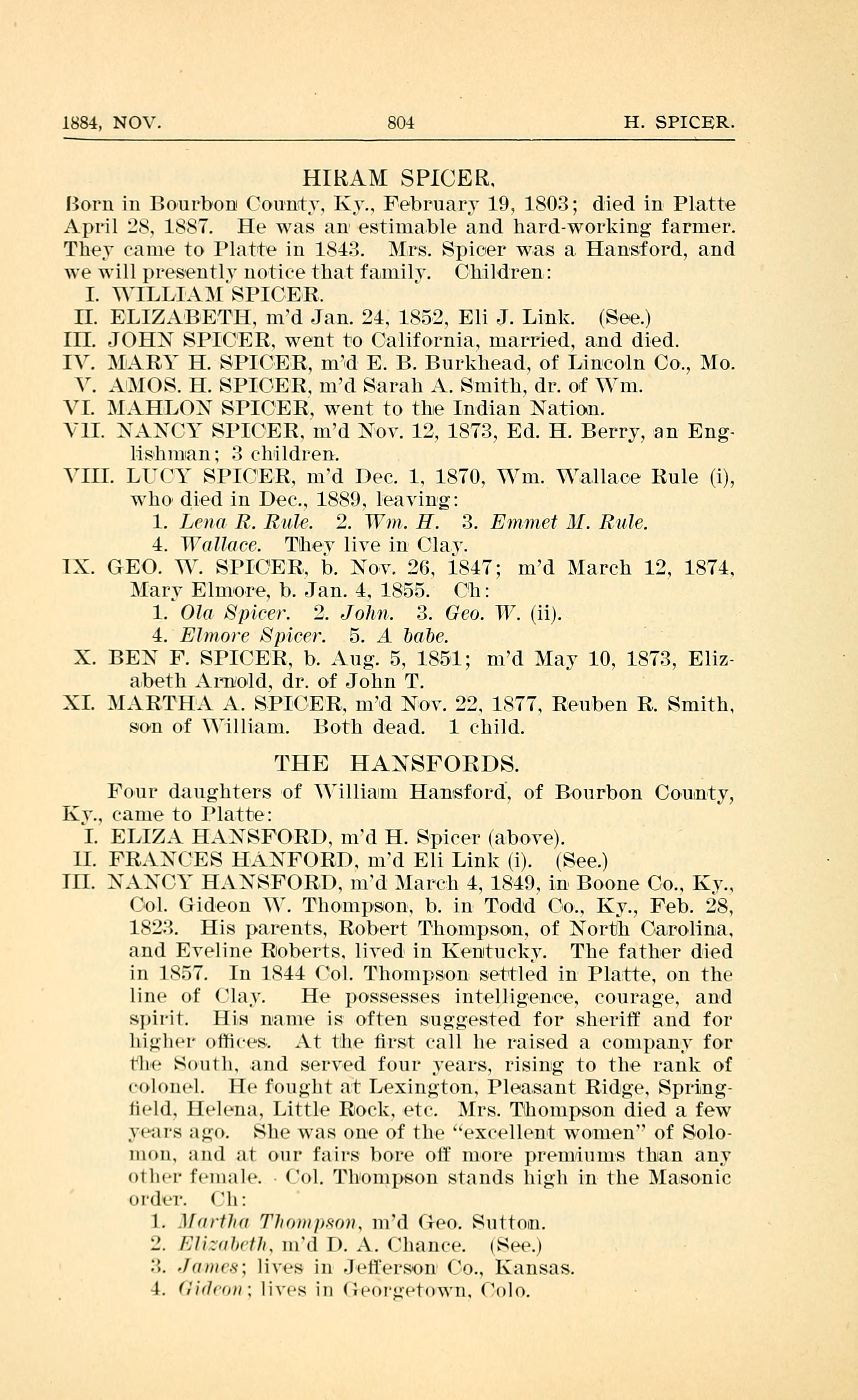 They came to Platte in 1843. Mrs. Spicer was a Hansford, and