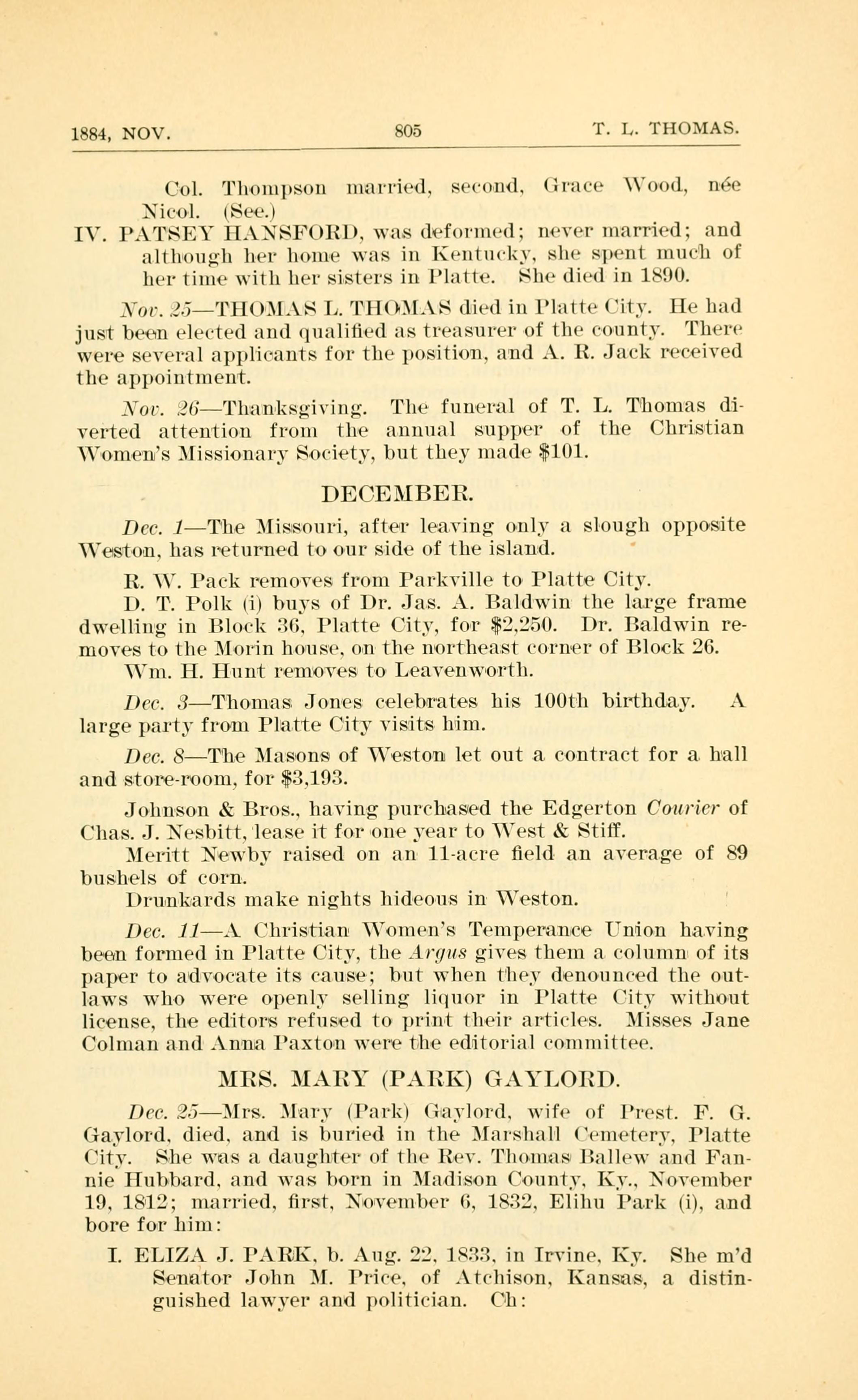 Nov. 25 - THOMAS L. THOMAS died in Platte City. He had just been elected and qualified as treaurer of the county. There were several applicants for the position, and A. R. Jack received the appointment.