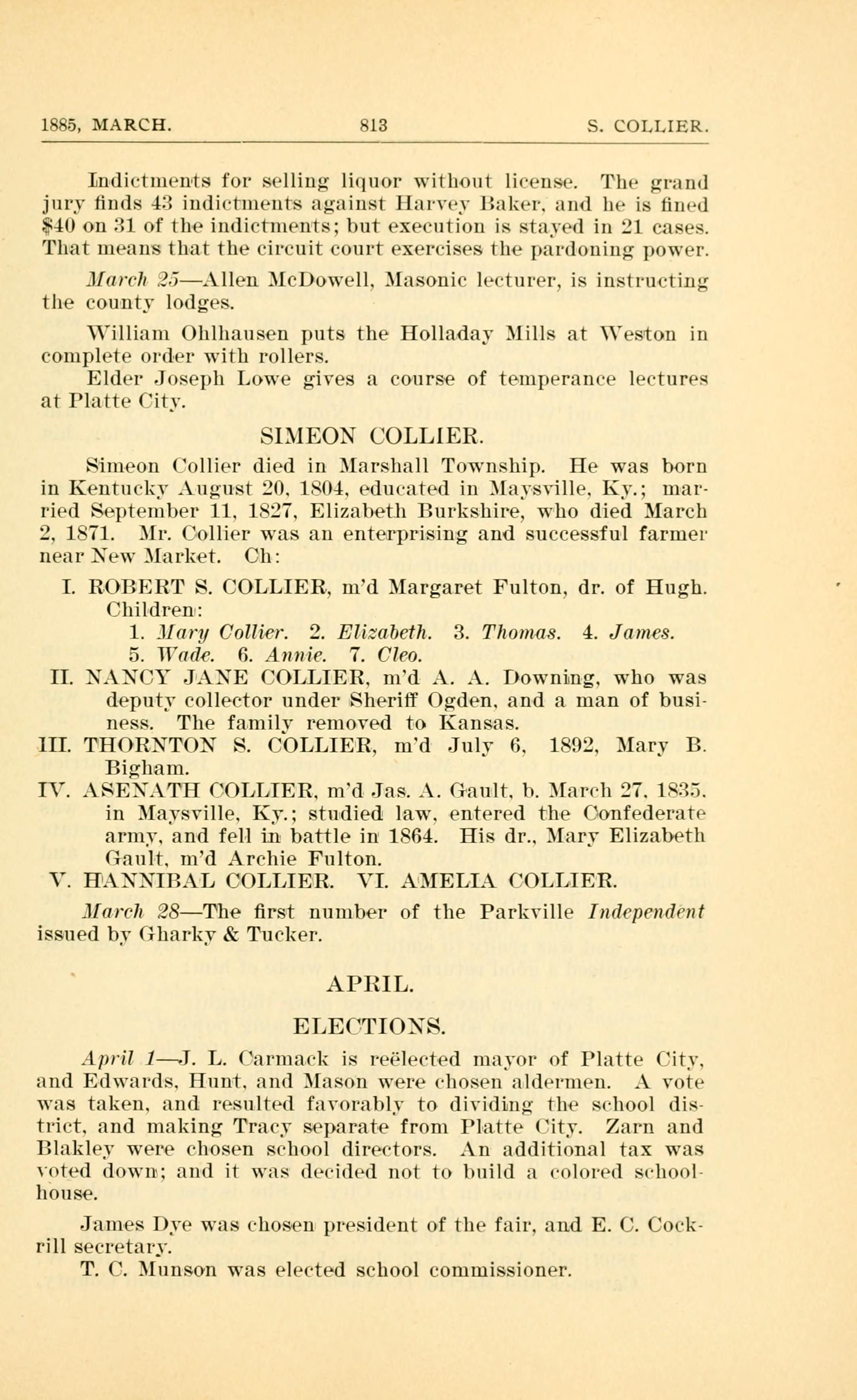 Simeon Collier died in Marshall Township. He was born in Kentucky August 20, 1804, educated in Maysville, Ky., married September 11, 1827, Elizabeth Burkshire, who died March 2, 1871. Mr. Collier was an enterprising and successful farmer near New Market.