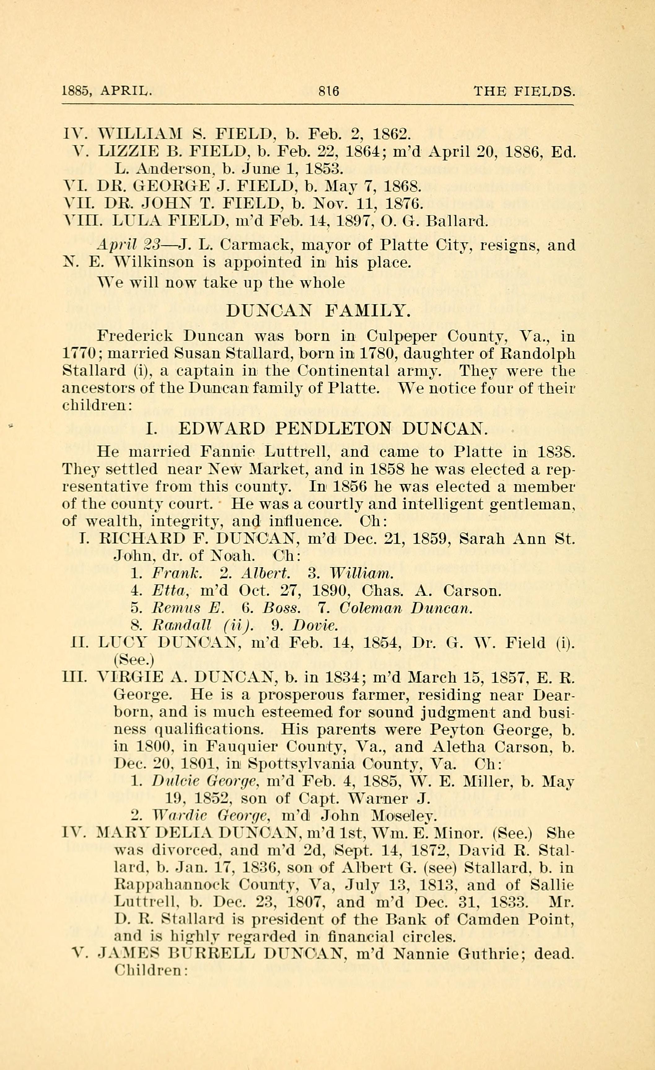 111. VIRGIE A. DUNCAN, b. in 1834; md March 15, 1857, E. R.