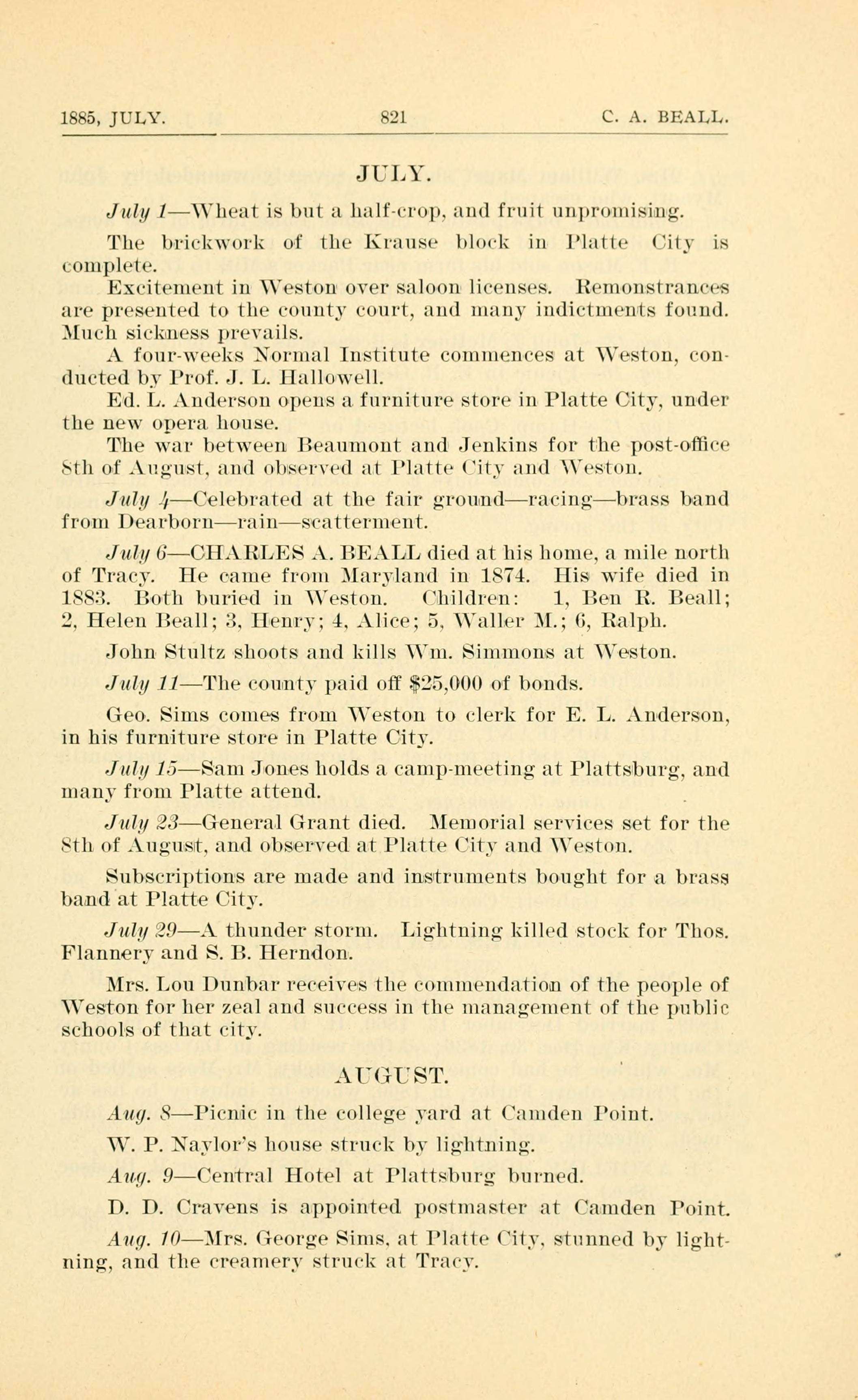 July 6 - CHARLES A. BEALL died at his home, a mile north of Tracy. He came from Maryland in 1874. His wife died in 1883. Both buried in Weston. Children: