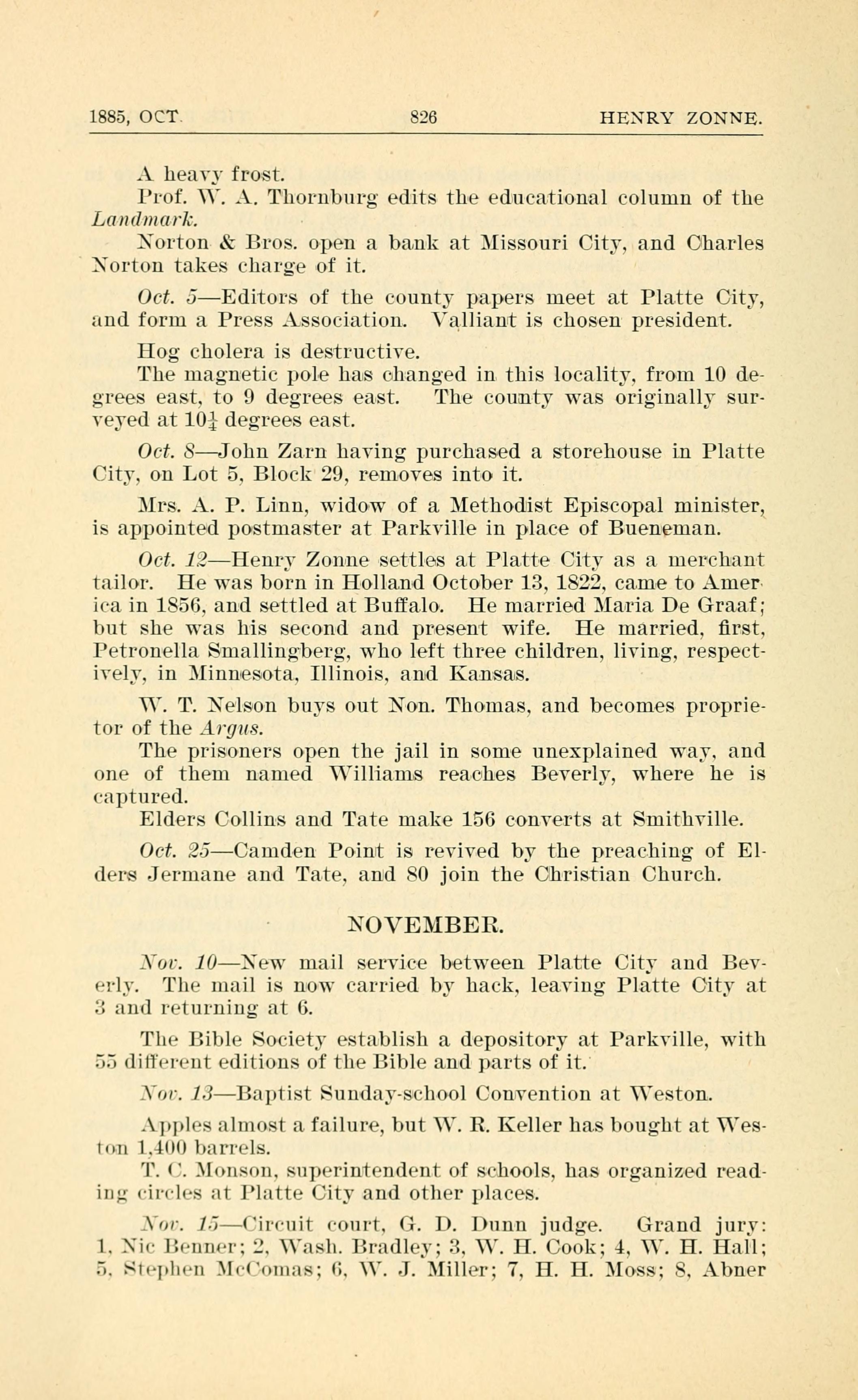 Oct. 12 Henry Zonne settles at Platte City as a. merchant tailor. He was born in Holland October 13, 1822, came to America. in 1856, and settled at Buffalo. He married Maria De Graaf; but she was his second and present Wife. He married, first, Petronella Smallingberg, who left three children, living, respectively, in Minnesota, Illinois, and Kansas.