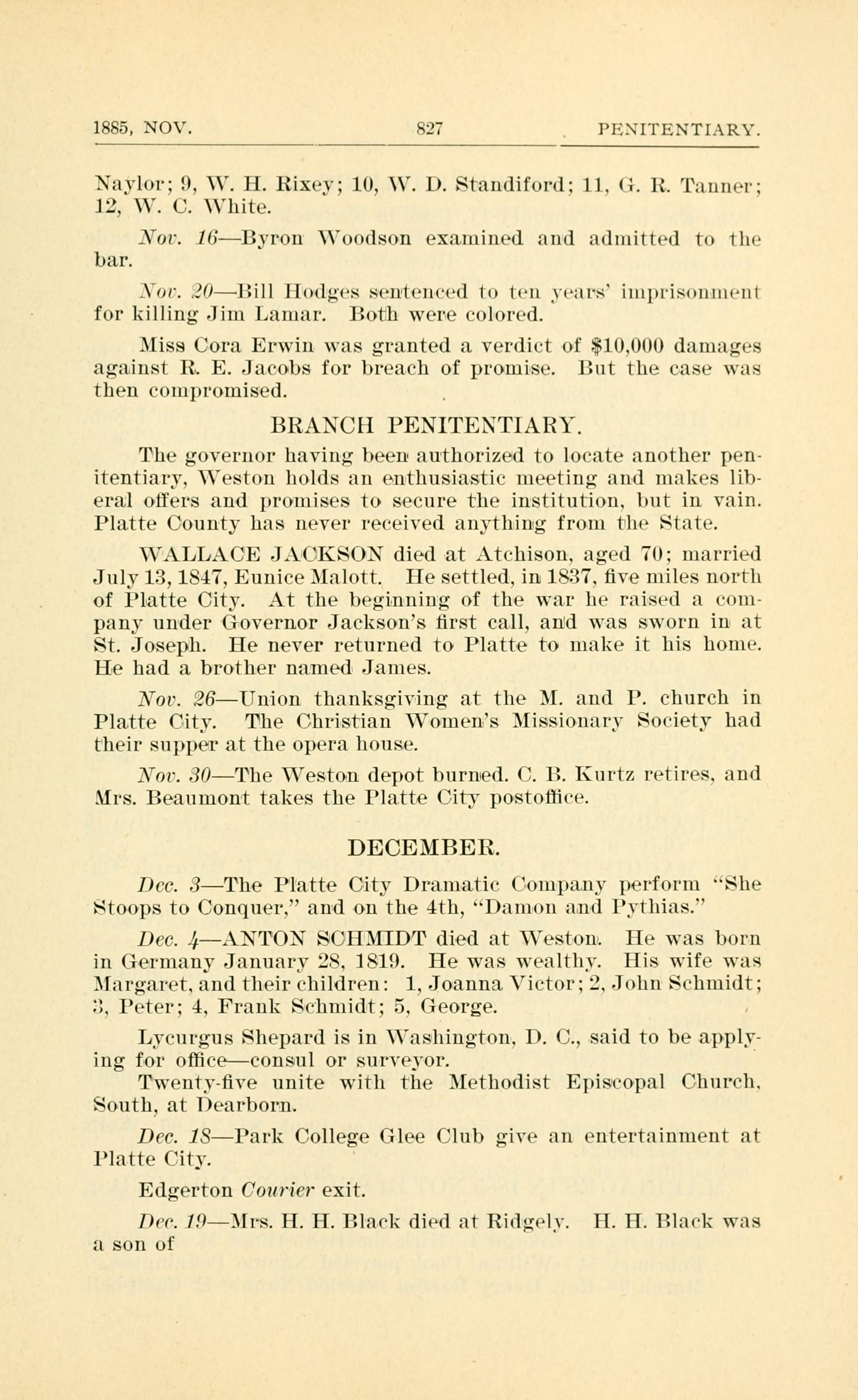 Dec. 3 The Platte City Dramatic Company perform She Stoops to Conquer, and on the 4th, Damon and Pythias."