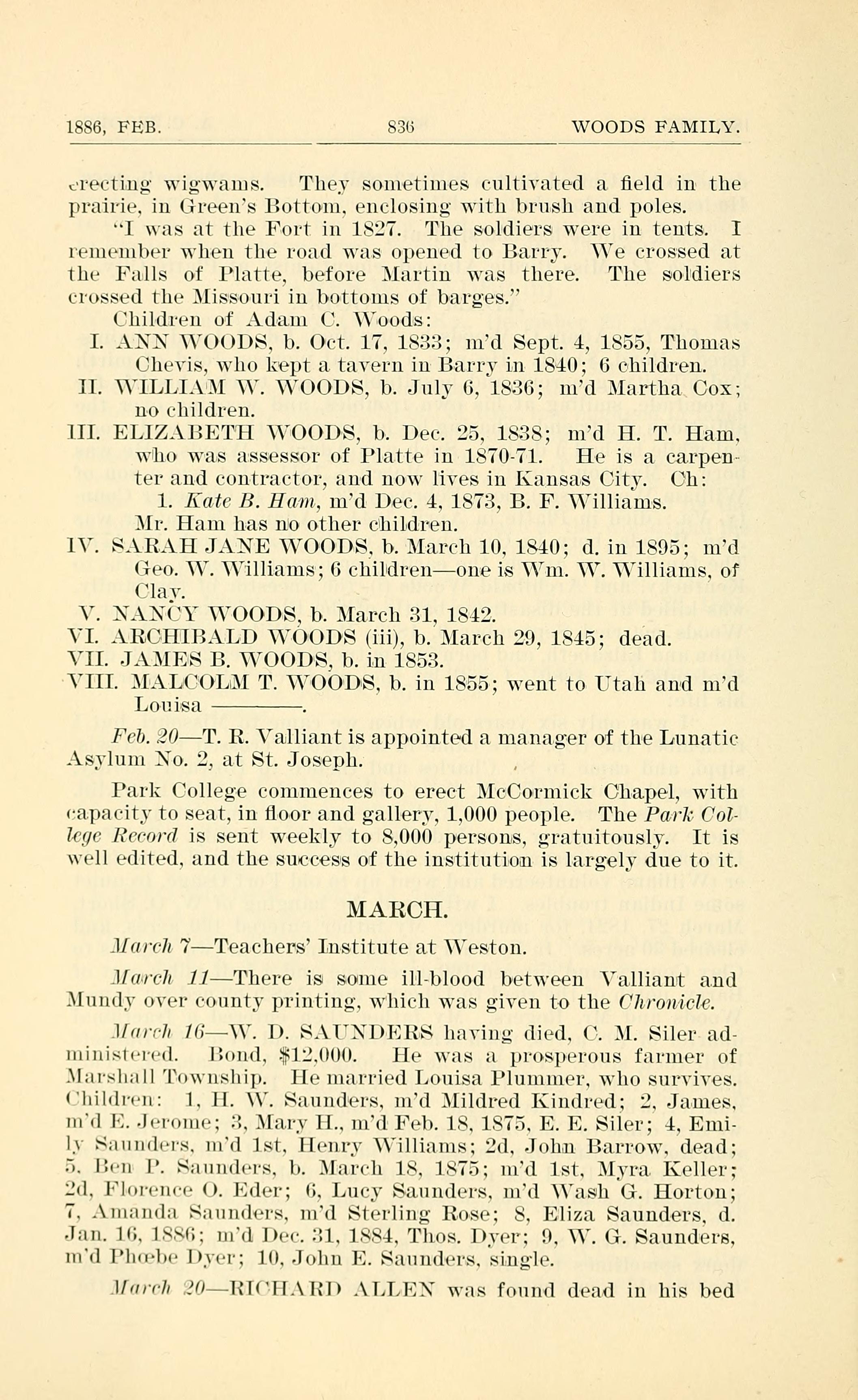 II. WILLIAM WOODS, b. Jul) (3, 1836; 1nd Martha Cox;